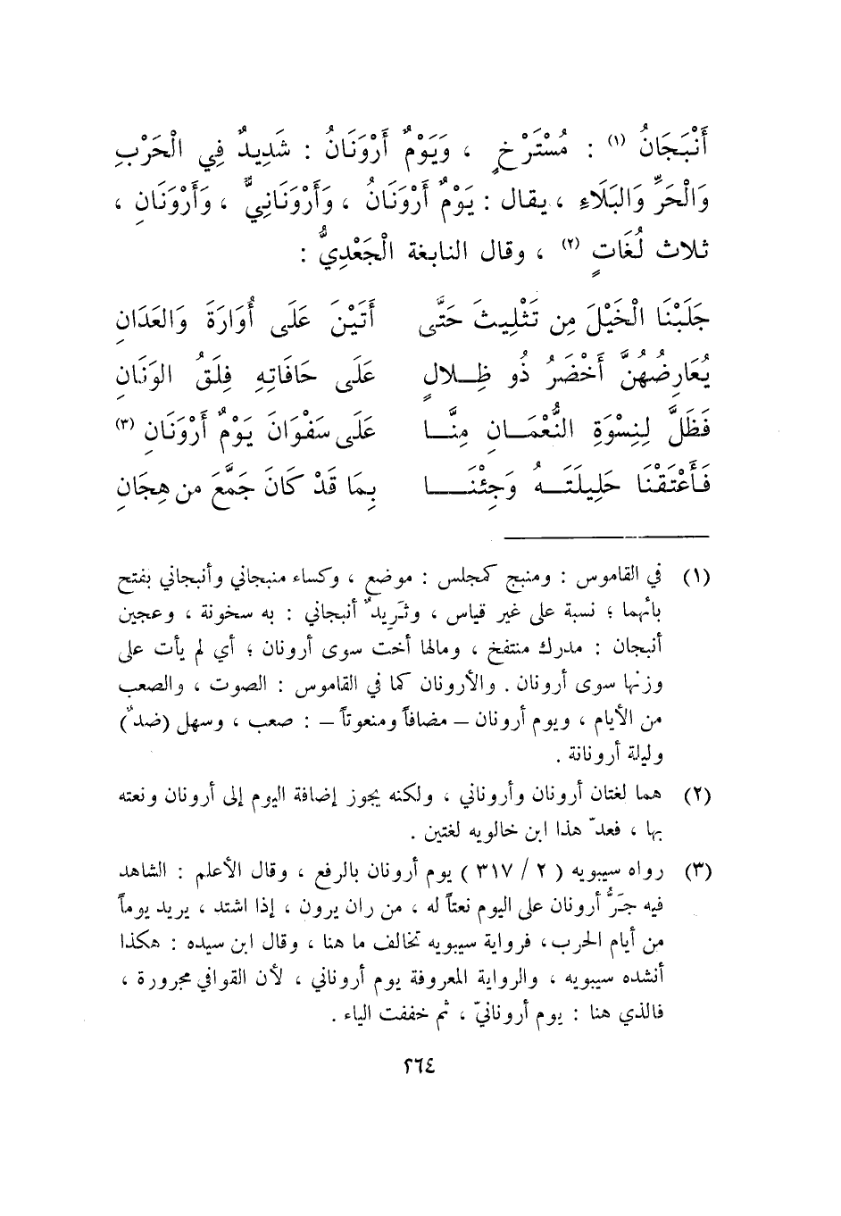 أنبجان: مسترخ، ويوم أرونان: شديد في الحرب والحر والبلاء، يقال: يوم أرونانُ، وأروناني، وأرونانِ، ثلاث لغات، وقال النابغة الجعدي: