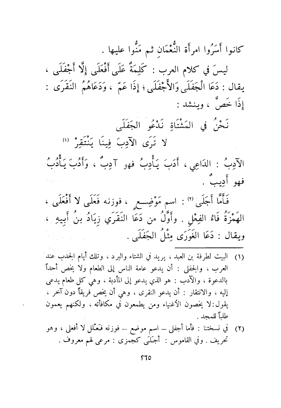 فأما أجلى: اسم موضع، فوزنه فعلى لا أفعلى، الهمزة فاء الفعل، وأول من دعا النقري زياد بن أبيه، ويقال: دعا الغورى مثل الجفلى.