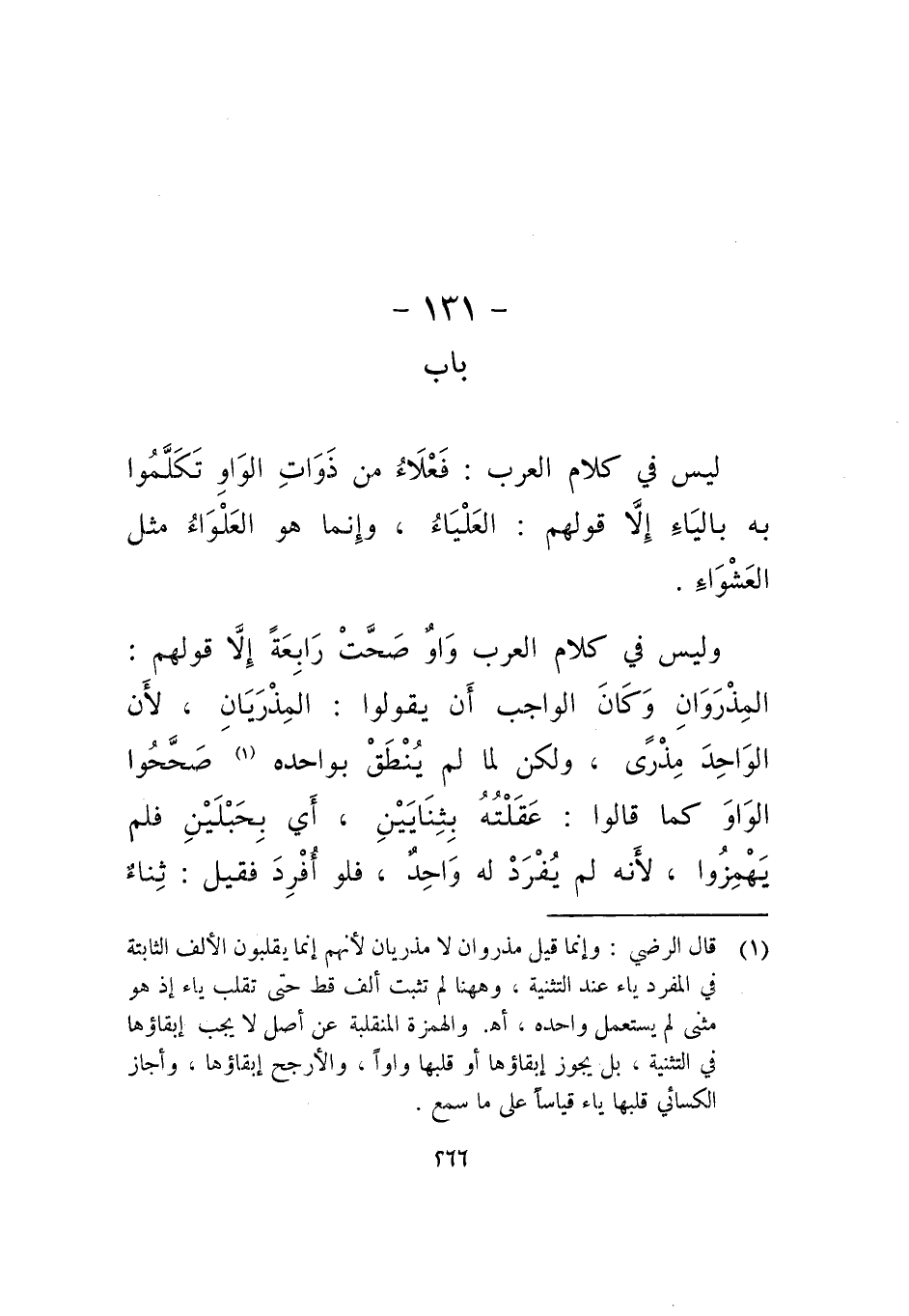 وليس في كلام العرب واو صحت رابعة إلا قولهم: المذروان وكان الواجب أن يقولوا: المذريان، لأن الواحد مذرى، ولكن لما لم ينطق بواحده صححوا الواو كما قالوا: عقلته بثنايين، أي بحبلين فلم يهمزوا، أنه لم يفرد له واحد، فلو أفرد فقيل: ثناء