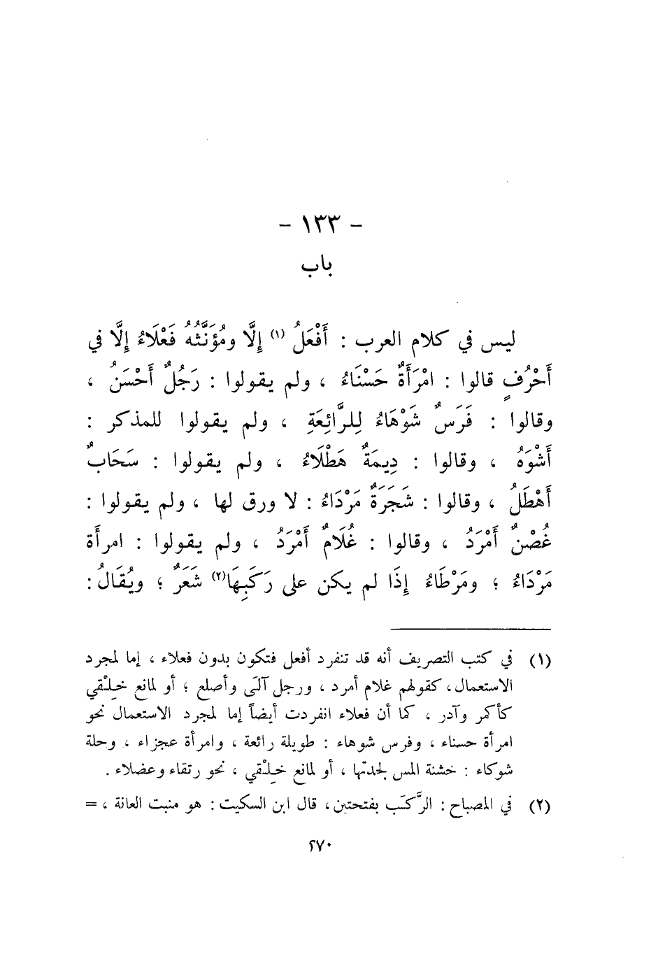 ليس في كلام العرب: أفعل إلا ومؤنثه فعلاء إلا في أحرف قالوا: امرأة حسناء، ولم يقولوا: رجل أحسن، وقالوا: فرس شوهاء للرائعة، ولم يقولوا للمذكر: أشوه، وقالوا: ديمة هطلاء، ولم يقولوا: سحاب أهطل، وقالوا: شجرة مرداء: لا ورق لها، ولم يقولوا: عصن أمرد، وقالوا: غلام أمرد، ولم يقولوا: امرأة مرداء، ومرطاء، إذا لم يكن على ركبها شعر، ويقال: