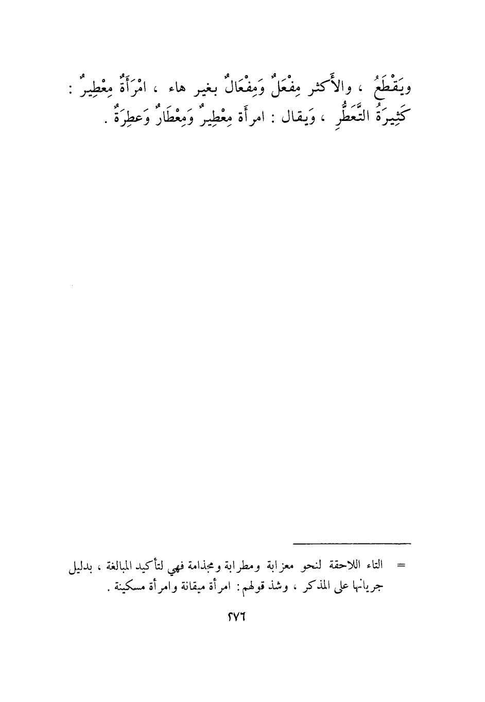 ويقطع، والأكثر مفعل ومفعال بغير هاء، امرأة معطير: كثيرة التعطر، ويقال: امرأة معطير ومعطار وعطرة.