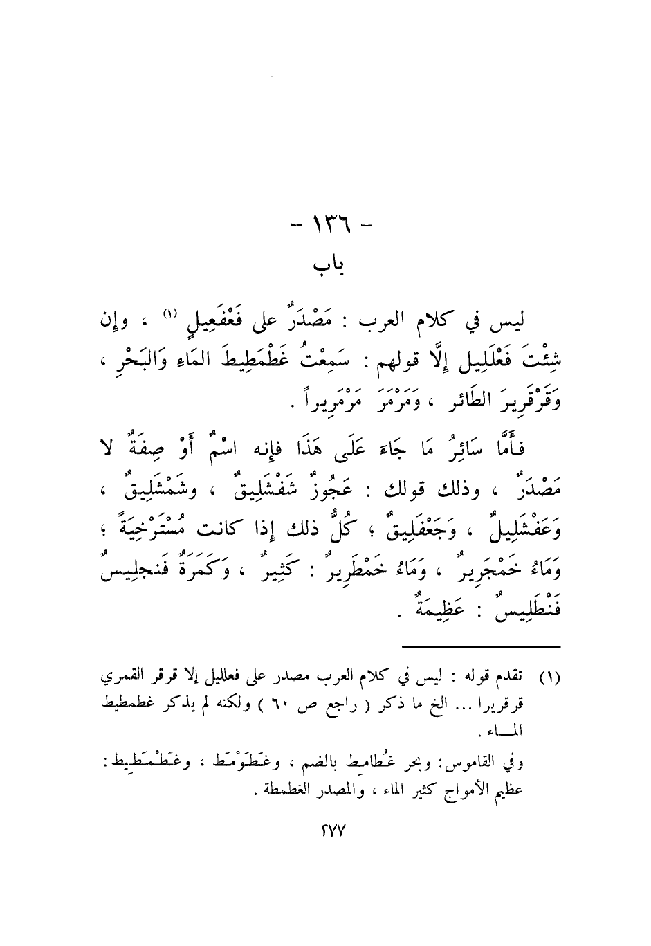 ليس في كلام العرب: مصدر على فعفعيل، وإن شئت فعلليل إلا قولهم: سمعت غطمطيط الماء والبحر، وقرقرير الطائر، ومرمر مرمريرا.