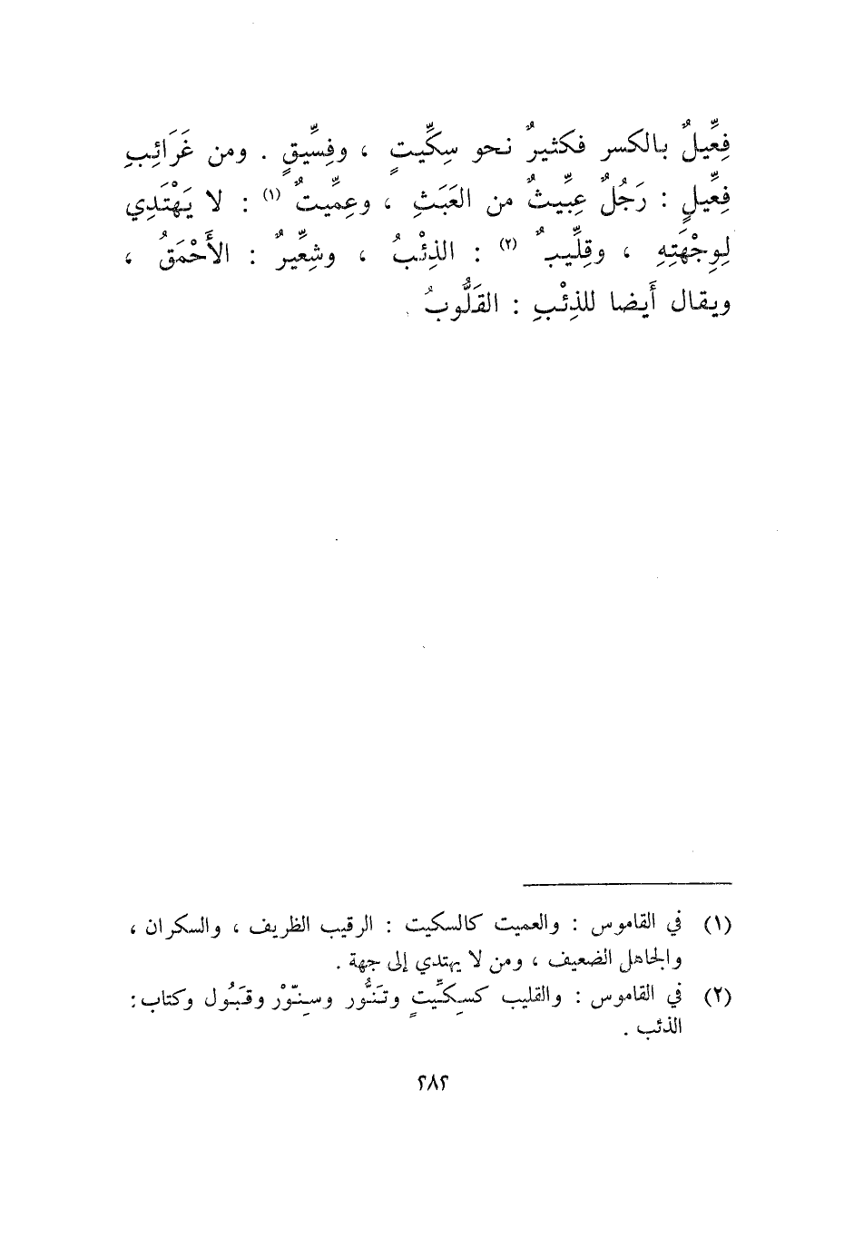 فِعيل بالكسر فكثير نحو سكيت، وفسيق، ومن غرائب فعيل: رجل عبيث من العبث، وعميت: لا يهتدي لوجهته، وقليبـ: الذئب، وشعير: الأحمق، ويقال أيضا للذئب: القلوب.