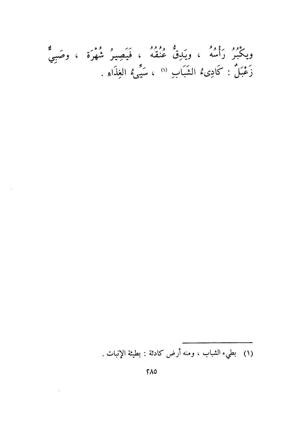 ويكبر رأسه، ويدق عنقه، فيصير شهرة، وصبي زعبل: كادئ الشباب، سيء الغذاء.
