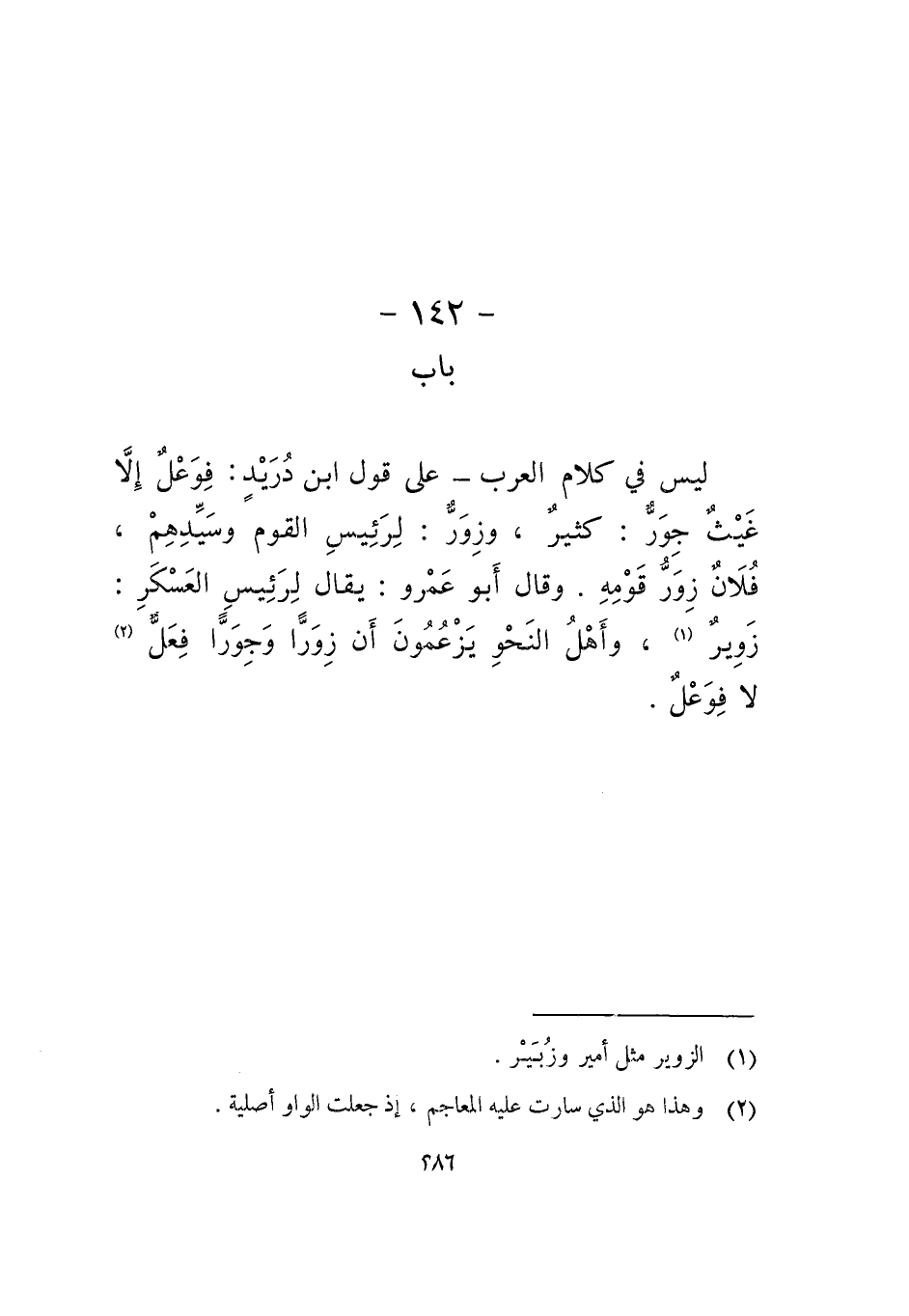 ليس في كلام العرب- على قول ابن دريد: فوعل إلا غيث جور: كثير، وزور: لرئيس القوم وسيدهم، فلان زور قومه، وقال أبو عمرو: يقال لرئيس العسكر: زوير، وأهل النحو يزعمون أن زورا وجورا فعل لا فوعل.