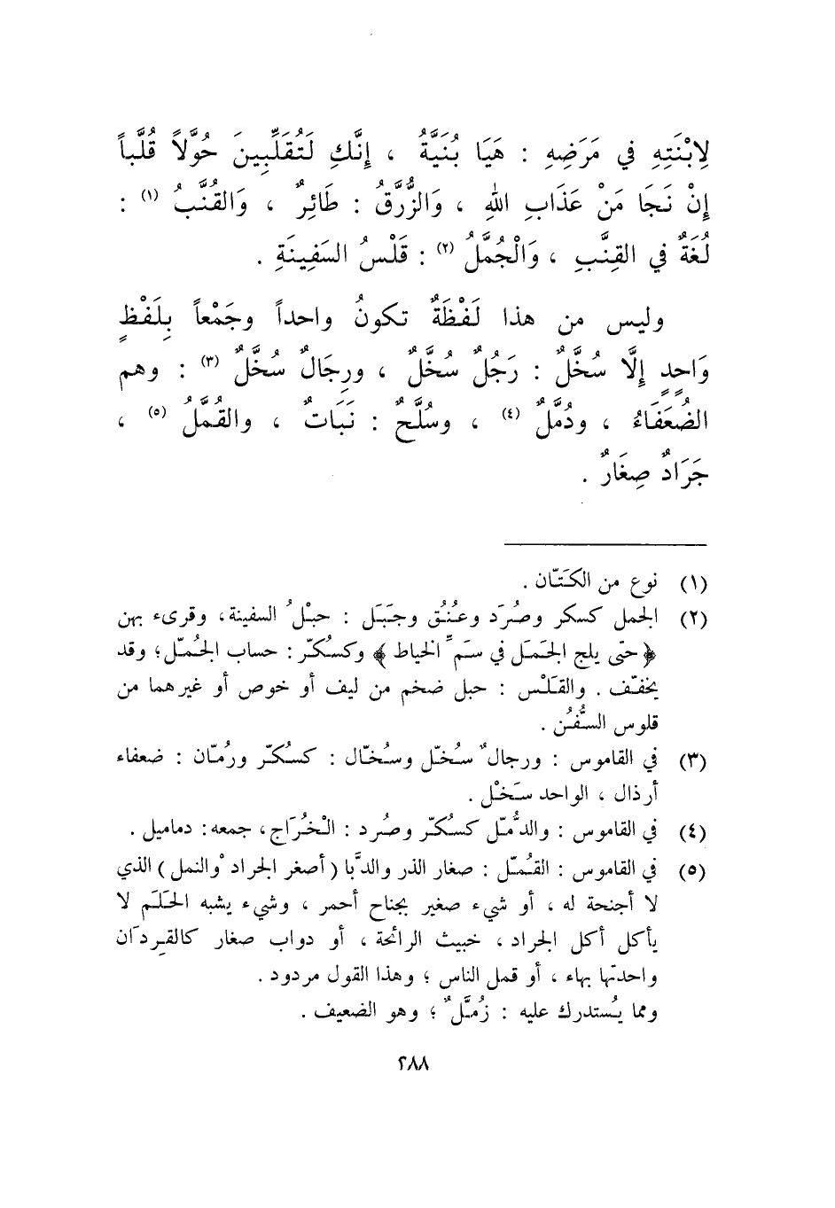 لابنته في مرضه: هيا بنية، إنك لتقلبين حولا قلبا إن نجا من عذاب الله، والزرق: طائر، والقنب: لغة في القِنب، والجُمل: قَلس السفينة.