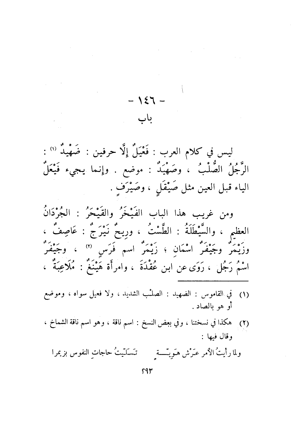 ومن غريب هذا الباب الفَيْخَر والقيجر: الجردان العظيم، والسيطلة: الطست، وريح نيرج: عاصف، وزيمر وجيفر اسمان، زيمر اسم فرس، وجيفر اسم رجل، روى عن ابن عقدة، وامرأة هينغ: ملا عبة،