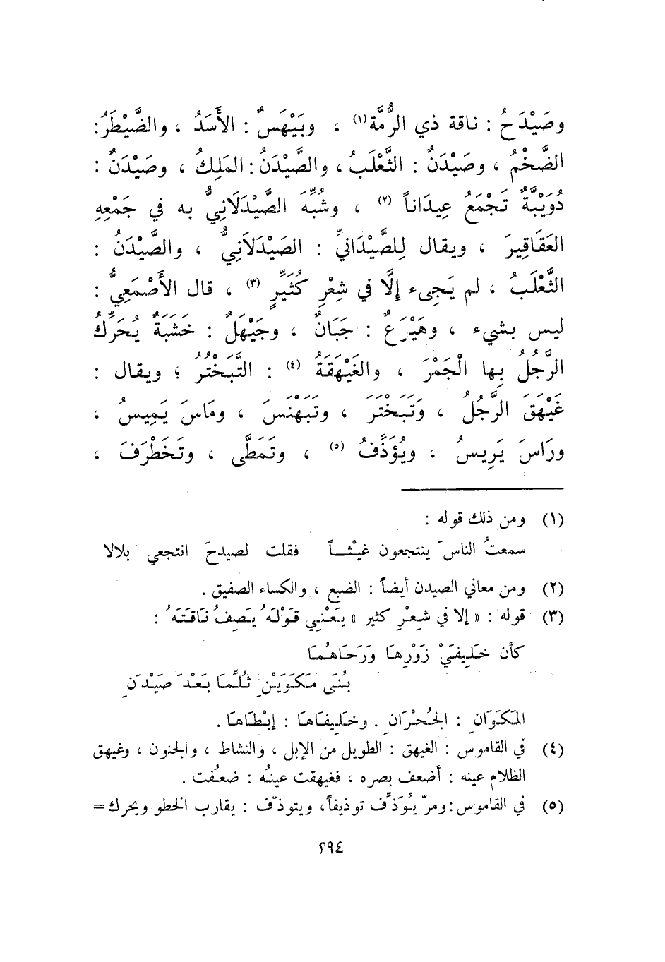 وصيدح: ناقة ذي الرمة، وبيهس: الأسد، والضيطر: الضخم، وصيدان: الثعلب، والصيدان: الملك، وصيدان: دويبة تجمع عيدانا، وشبه الصيدلاني به في جمعه العقاقير، ويقال للصيداني: الصيدلاني، والصيدان: الثعلب، لم يجئ إلا في شعر كثير، قال الأصمعي: ليس بشئ، وهيرع: جبان، وجيهل: خشبة يحرك الرجل بها الجمر، والغيهقة: التبختر؛ ويقال: غيهق الرجل، وتبختر، وتبهنس، وماس يميس، وراس يريس، ويؤذف، وتمطى، وتخطرف،