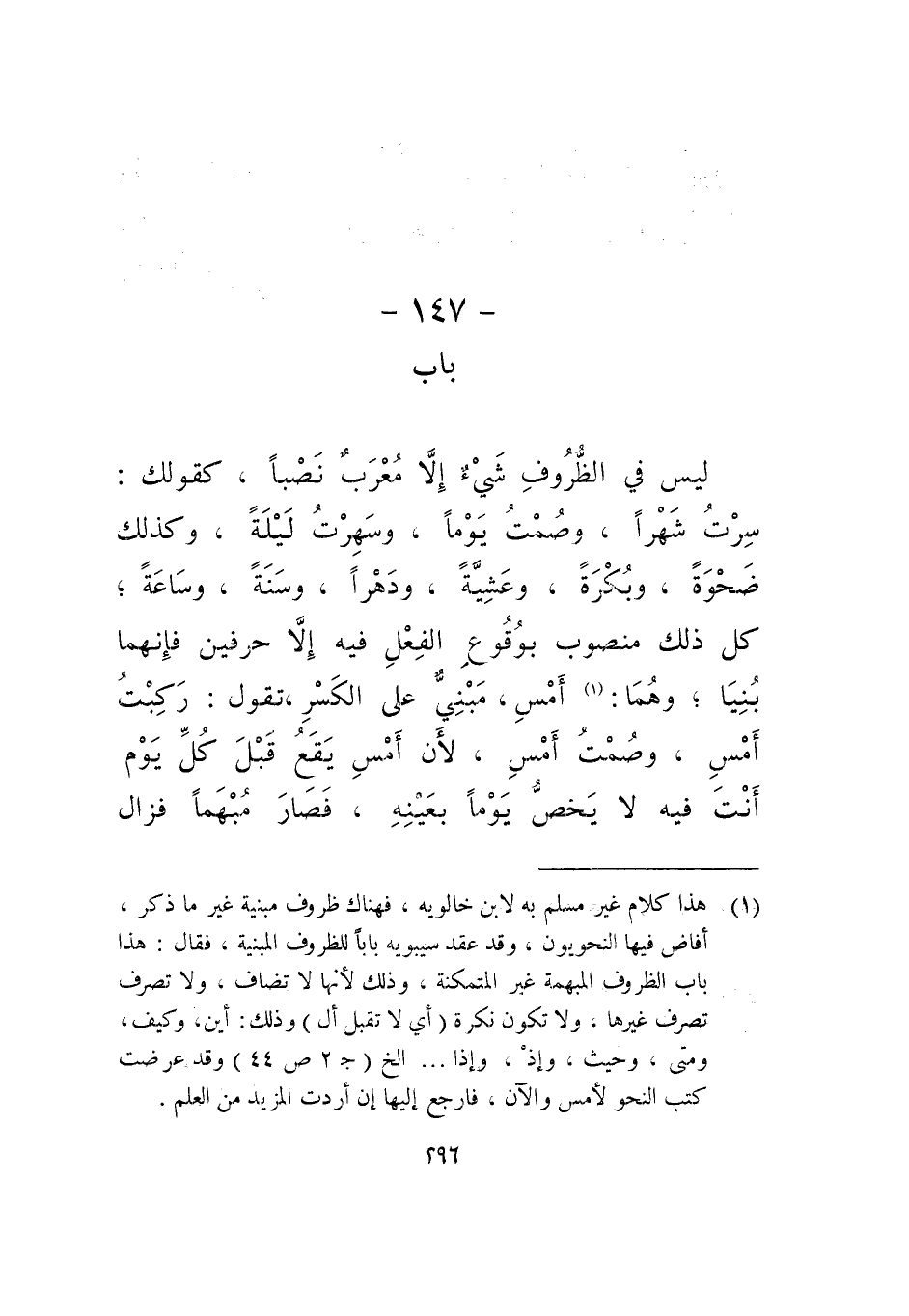 ليس في الظروف شيء إلا معرب نصبا، كقولك: سرت شهرا، وصمت يوما، وسهرت ليلة، وكذلك ضحوة، وبكرة، وعشية، ودهرا، وسنة، وساعة، كل ذلك منصوب بوقوع الفعل فيه إلا حرفين فإنهما بنيا؛ وهما: أمس، مبني على الكسر تقول: ركبت أمس، وصمت أمس، لأن أمس يقع قبل كل يوم أنت فيه لا يخص يوما بعينه، فصار مبهما فزال