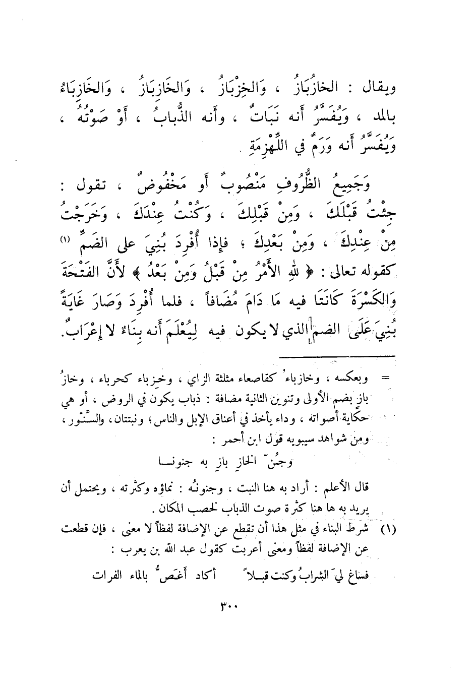 وجميع الظروف منصوب أو مخفوض، تقول: جئت قبلك، ومن قبلك، وكنت عندك، وخرجت من عندك، ومن بعدك، فإذا أفرد بني على الضم، كقوله تعالى: (لله الأمر من قبل ومن بعد) لأن الفتحة والكسرة كانتا فيه مادام مضافا، فلما أفرد وصار غاية بني على الضم الذي لا يكون فيه ليعلم أنه بناء لا إعراب.