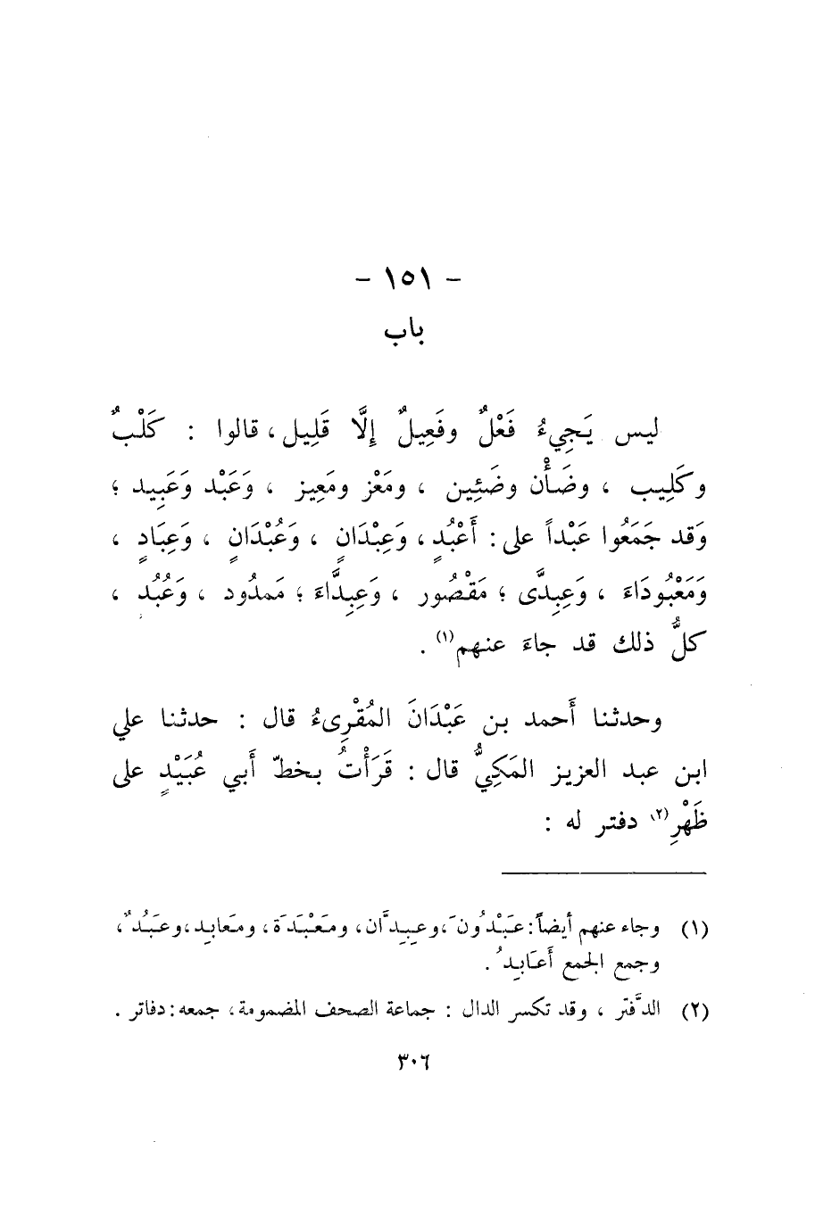 ليس يجيء فعل وفعيل إلا قليل، قالوا: كلب وكليب، وضأن وضئين، ومعز ومعيز، وعبد وعبيد، وقد جمعوا عبدا على: أعبد، وعِبدان، وعُبدان، وعباد، ومعبوداء، وعِبدى، مقصور، وعبداء ممدود، وعبد كل ذلك قد جاء عنهم.