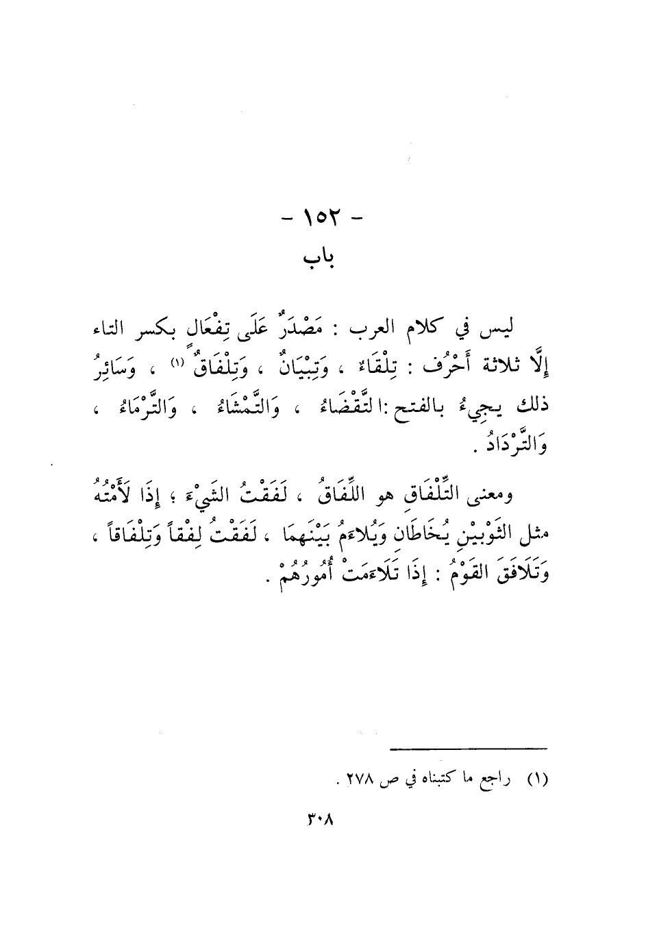 ليس في كلام العرب: مصدر على تفعال بكسر التاء إلا ثلاثة أحرف: تلقاء وتبيان وتلفاق، وسائر ذلك يجئ بالفتح: التقضاء، والتمشاء، والترماء، والترداد.