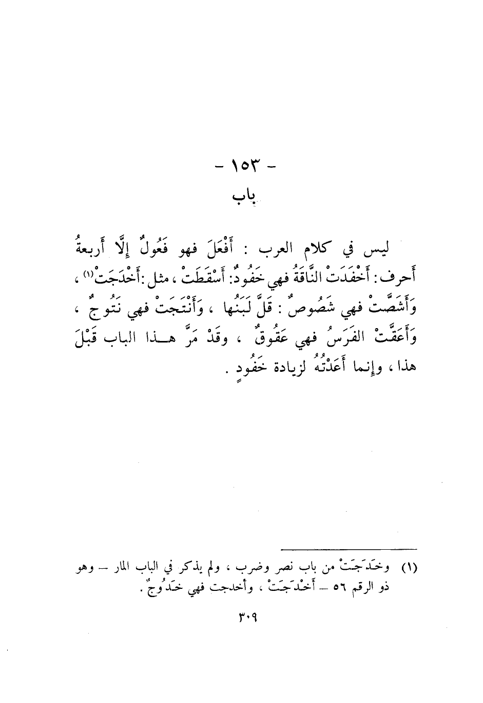 ليس في كلام العرب: أفعل فهو فعول إلا أربعة أحرف: أخفدت الناقة فهي خفود: أسقطت، مثل أخدجت، وأشصت فهي شصوص: قبل لبنها، وأنتجت فهي نتوج، وأعقت الفرس فهي عقوق، وقد مر هذا الباب قبل هذا، وإنما أعدته لزيادة خفود.