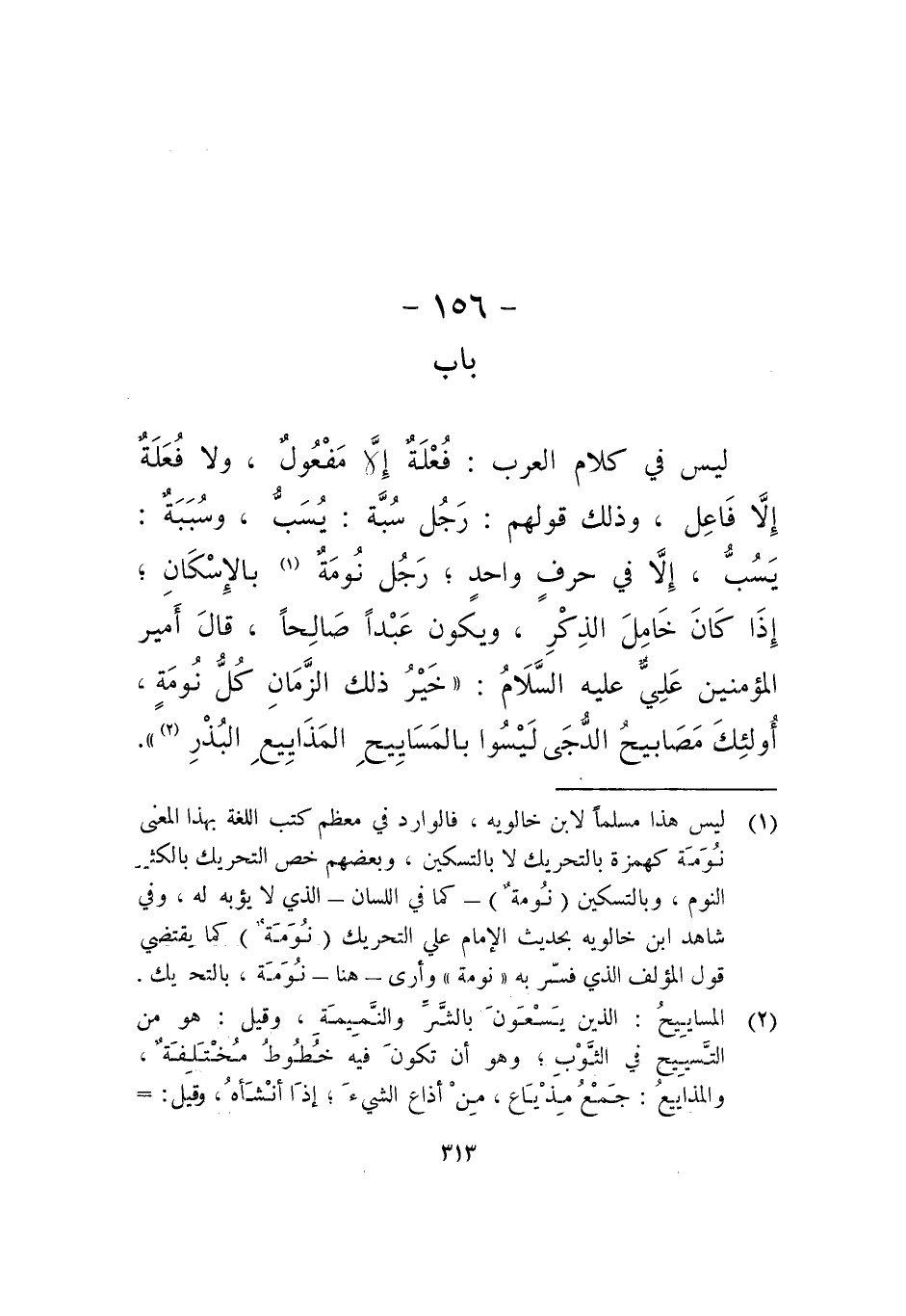 ليس في كلام العرب: فعلة إلا مفعول، ولا فعلة إلا فاعل، وذلك قولهم: رجل سبة: يسب، وسببة: يسب، إلا في حرف واحد، رجل نومة بالإسكان إذا كان خامل الذكر، ويكون عبدا صالحا، قال أمير المؤمنين علي عليه السلام: خير ذلك الزمان كل نومة، أولئك مصابيح الدجى ليسوا بالمساييح المذاييع البذر).
