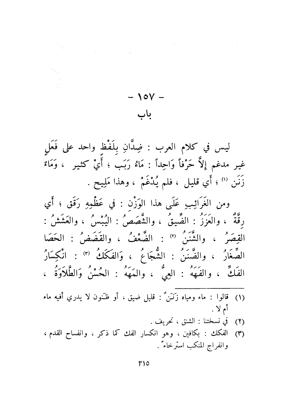 ليس في كلام العرب: ضدان بلفظ واحد على فعل غير مدغم إلا حرفا واحدا، ماء ربب، أي كثير، وماء زنن، أي قليل، فلم يدغم، وهذا مليح