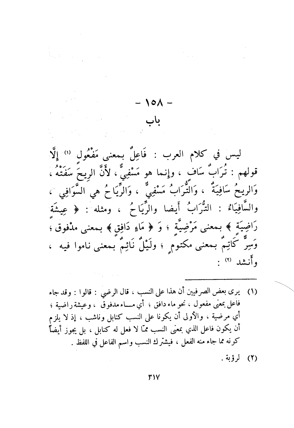 ليس في كلام العرب: فاعل بمعنى مفعول إلا قولهم: تراب ساف، وإنما هو مسفي لأن الريح سفته، والريح سافية، والتراب مسفي، والرياح هي السوافي، والسافياء: التراب أيضا والرياح ومثله: (عيشة راضية) بمعنى مرضية، و (ماء دافق) بمعنى مدفوق، وسر كاتم بمعنى مكتوب، وليل نائم بمعنى ناموا فيه، وأنشد: