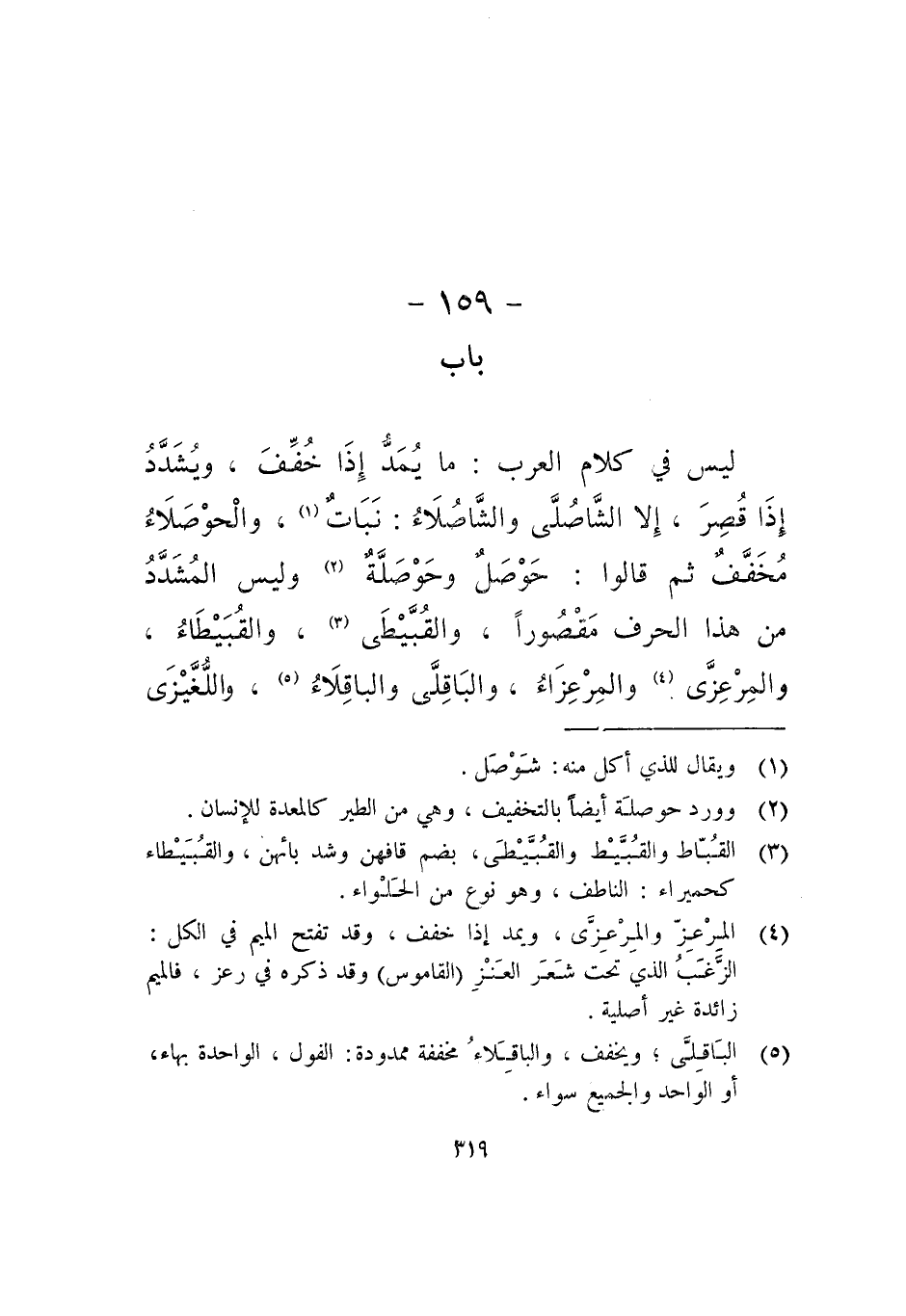 ليس في كلام العرب: ما يُمد إذا خُفف، ويشدد إذا قصر، إلا الشاصلى والشاصلاء: نبات، والحوصلاء مخفف ثم قالوا: حوصل وحوصلة وليس المشدد من هذا الحرف مقصورا، والقُبيطى، والقبيطاء، والمرعزى والمرعزاء، والباقلى والباقلاء، واللغيزى
