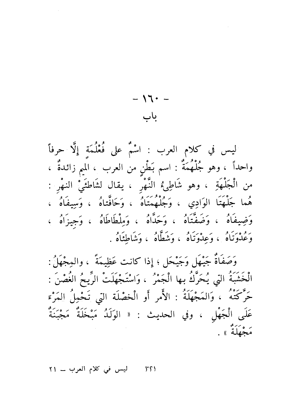 ليس في كلام العرب: اسم على فُعْلُمَة إلا حرفا واحداً، وهو جُلْهُمَة: اسم بطن من العرب، الميم زائدة، من الجلهة، وهو شاطئ النهر، يقال لشاطئي النهر: هما جلهتا الوادي، وجلهتماه، وحافتاه، وسيفاه، وضيفاه، وضفتاه، وحداه، وملطاطاه، وجيزاه، وعُدوتاه، وعِدوتاه، وشطاه، وشاطئاه.