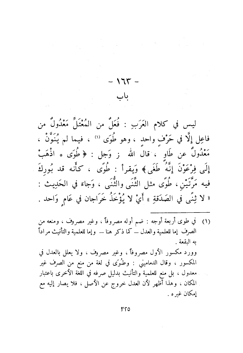 ليس في كلام العرب: فعل من المعتل معدول من فاعل إلا في حرف واحد، وهو طوى، فيما لم ينون، معدول عن طاو، قال الله عز وجل: (طوى، اذهب إلى فرعون إنه طغى) ويقرأ: طوى، كأنه قد بورك فيه مرتين، طوى مثل الثٍّنى والُّنى، وجاء في الحديث: لا ثنى في الصدقة، أي لا يؤخذ خراجان في عام واحد.