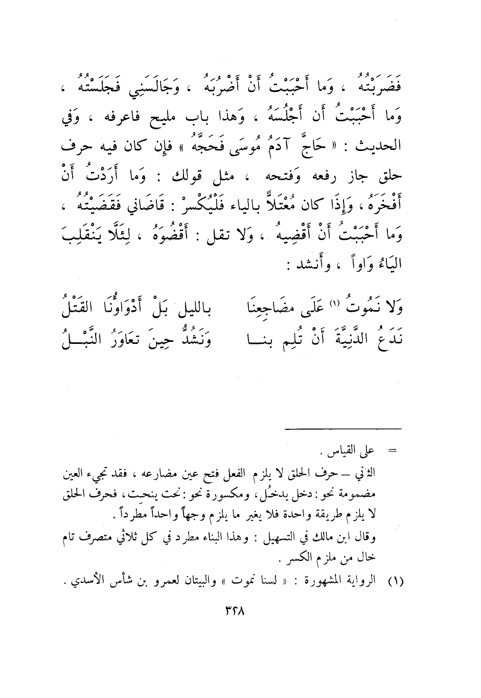 فضربته، وما أحببت أن أضرُبه، وجالسني فجلسته، وما أحببت أن أجلُسه، وهذا باب مليح فاعرفه، وفي الحديث: (حاج آدم موسى فحَجَّهُ) فإن كان فيه حرف حلق جاز رفعه وفتحه، مثل قولك: وما أردت أن افخره، وإذا كان معتلا بالياء فليكسر: فاضاني فقضيته، وما أحببت أن أقضيه، ولا تقل: أقضوه، لئلا ينقلب الياء واوا، وأنشد: