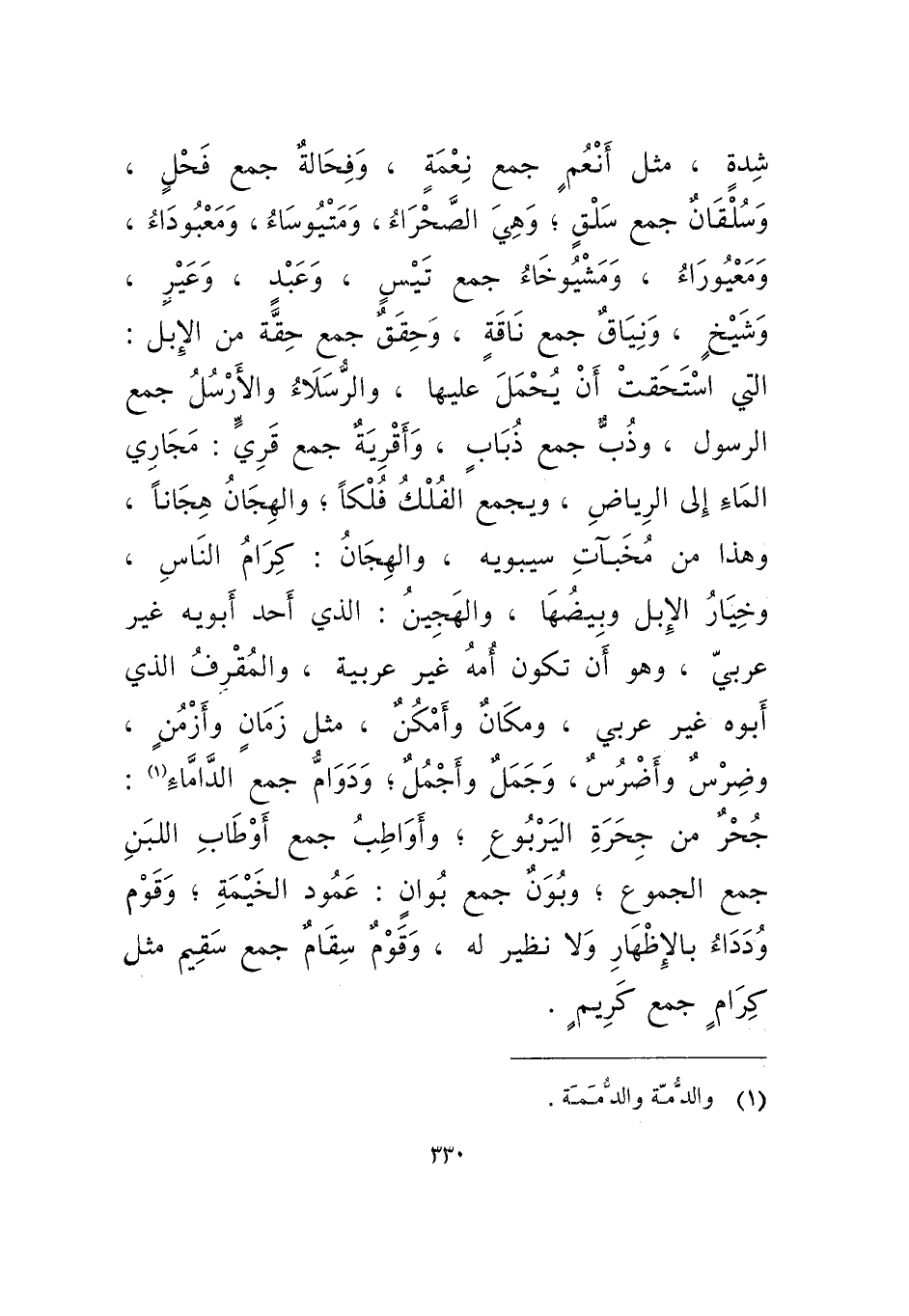 شدة، مثل أنعم جمع نعمة، وفحالة جمع فحل، وسلقان جمع سلق وهي الصحراء، ومتيوساء، ومعبوداء، ومعيوراء، ومشيوخاء جمع تيس، وعبد وعير، وشيخ، ونياق جمع ناقة، وحقق جمع حقة من الإبل: التي استحقت أن يحمل عليها، والرسلاء والأرل جمع الرسول، وذب جمع ذباب، وأقرية جمع قري: مجاري الماء إلى الرياض، ويجمع الفلك فلكا، والهجان هجانا، وهذا من مخبآت سيبويه، والهجان: كرام الناس، وخيار الإبل وبيضها، والهجين: الذي أحد أبويه غير عربي، وهو أن تكون أمه غير عربية، والمقرف الذي أبوه غير عربي، ومكان وأمكن، مثل زمان وأزمن، وضرس وأضرس، وجمل وأجمل، ودوام جمع الداماء: جحر من جحرة اليربوع، وأواطب جمع أوطاب اللبن جمع الجموع؛ وبون جمع بوان: عمود الخيمة، وقوم ودداء بالإظهار ولا نظير له، وقوم سِقام جمع سقيم مثل كرام جمع كريم.