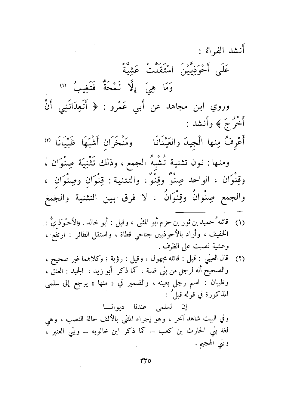 ومنها: نون تثنية تشبه الجمع، وذلك تثنية صنوان، وقنوان، الواحد صنو وقنو، والتثنية: قنوان وصنوان، والجمع صنوان وقنوان، لا فرق بين التثنية والجمع