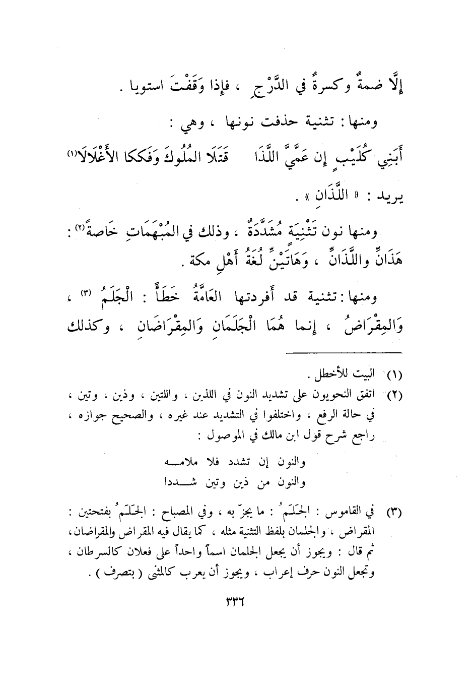 ومنها نون تثنية مشددة، وذلك في المبهمات خاصة: هذان واللذان، وهاتين لغة أهل مكة.