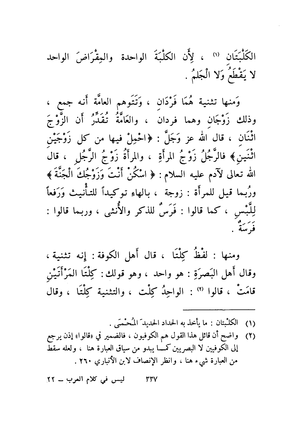 ومنها تثنية هما فردان، وتتوهم العامة أنه جمع، وذلك زوجان وهما فردان، والعامة تقدر أن الزوج اثنان، قال الله عز وجل: (احمل فيها من كل زوجين اثنين) فالرجل زوج المرأة، والمرأة زوج الرجل، قال الله تعالى لآدم عليه السلام: (اسكن أنت وزوجك الجنة) وربما قيل للمرأة: زوجة، بالهاء توكيدا للتأنيث ورفعا للبس، كما قالوا: فرس للذكر والأنثى، وربما قالوا: فرسة.