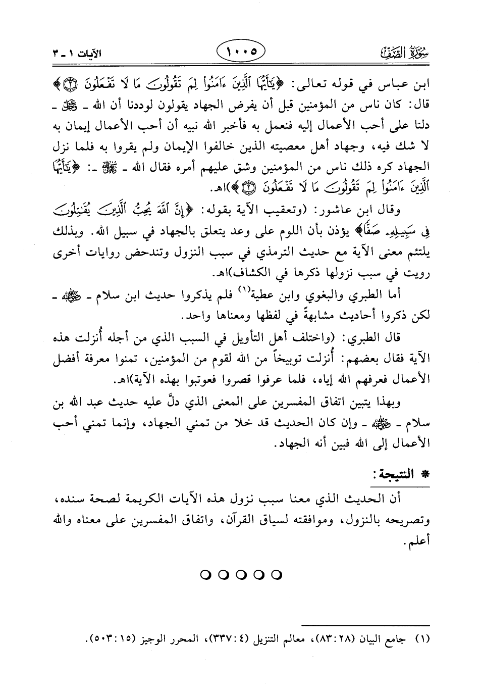 وبهذا يتبين اتفاق المفسرين على المعنى الذي دلَّ عليه حديث عبد اللَّه بن سلام - رَضِيَ اللَّهُ عَنْهُ - وإن كان الحديث قد خلا من تمني الجهاد، وإنما تمني أحب الأعمال إلى اللَّه فبين أنه الجهاد.
