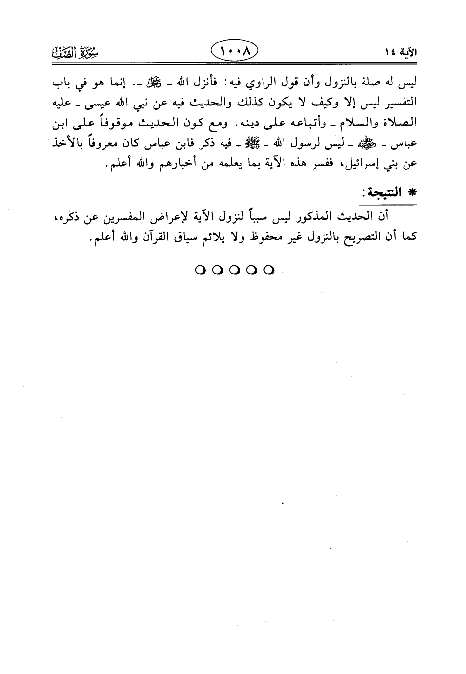 ليس له صلة بالنزول وأن قول الراوي فيه: فأنزل الله - عزَّ وجلَّ -. إنما هو في باب التفسير ليس إلا وكيف لا يكون كذلك والحديث فيه عن نبي الله عيسى - عليه الصلاة والسلام - وأتباعه على دينه. ومع كون الحديث موقوفاً على ابن عباس - رَضِيَ اللَّهُ عَنْهُ - ليس لرسول اللَّه - صَلَّى اللَّهُ عَلَيْهِ وَسَلَّمَ - فيه ذكر فابن عبَّاسٍ كان معروفاً بالأخذ عن بني إسرائيل، ففسر هذه الآية بما يعلمه من أخبارهم واللَّه أعلم.