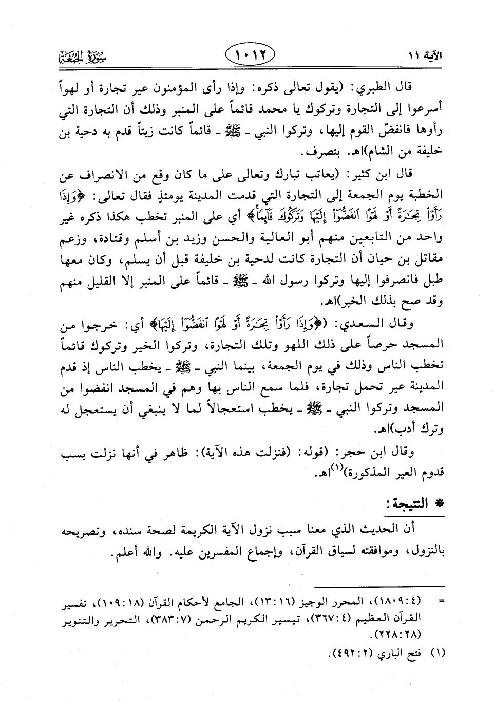 وقال ابن حجر: (قوله: (فنزلت هذه الآية): ظاهر فى أنها نزلت بسب قدوم العير المذكورة) اهـ.