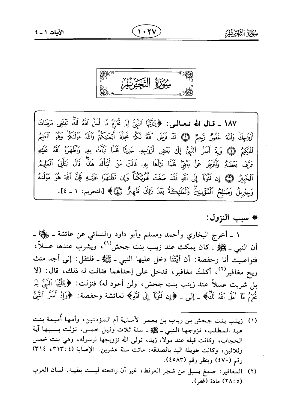 187 - قال الله تعالى: (يَا أَيُّهَا النَّبِيُّ لِمَ تُحَرِّمُ مَا أَحَلَّ اللَّهُ لَكَ تَبْتَغِي مَرْضَاتَ أَزْوَاجِكَ وَاللَّهُ غَفُورٌ رَحِيمٌ (1) قَدْ فَرَضَ اللَّهُ لَكُمْ تَحِلَّةَ أَيْمَانِكُمْ وَاللَّهُ مَوْلَاكُمْ وَهُوَ الْعَلِيمُ الْحَكِيمُ (2) وَإِذْ أَسَرَّ النَّبِيُّ إِلَى بَعْضِ أَزْوَاجِهِ حَدِيثًا فَلَمَّا نَبَّأَتْ بِهِ وَأَظْهَرَهُ اللَّهُ عَلَيْهِ عَرَّفَ بَعْضَهُ وَأَعْرَضَ عَنْ بَعْضٍ فَلَمَّا نَبَّأَهَا بِهِ قَالَتْ مَنْ أَنْبَأَكَ هَذَا قَالَ نَبَّأَنِيَ الْعَلِيمُ الْخَبِيرُ (3) إِنْ تَتُوبَا إِلَى اللَّهِ فَقَدْ صَغَتْ قُلُوبُكُمَا وَإِنْ تَظَاهَرَا عَلَيْهِ فَإِنَّ اللَّهَ هُوَ مَوْلَاهُ وَجِبْرِيلُ وَصَالِحُ الْمُؤْمِنِينَ وَالْمَلَائِكَةُ بَعْدَ ذَلِكَ ظَهِيرٌ (4)