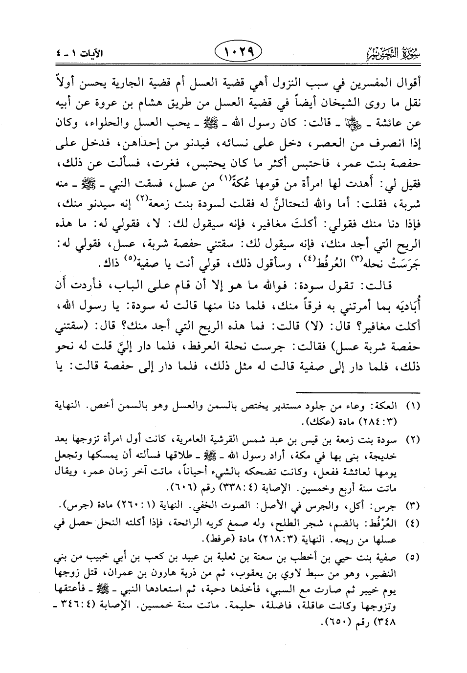 أقوال المفسرين في سبب النزول أهي قضية العسل أم قضية الجارية يحسن أولاً نقل ما روى الشيخان أيضاً في قضية العسل من طريق هشام بن عروة عن أبيه عن عائشة - رضي الله عنها - قالت: كان رسول اللَّه - صَلَّى اللَّهُ عَلَيْهِ وَسَلَّمَ - يحب العسل والحلواء، وكان إذا انصرف من العصر، دخل على نسائه، فيدنو من إحداهن، فدخل على حفصة بنت عمر، فاحتبس أكثر ما كان يحتبس، فغرت، فسألت عن ذلك، فقيل لي: أَهدت لها امرأة من قومها عُكةً من عسل، فسقت النبي - صَلَّى اللَّهُ عَلَيْهِ وَسَلَّمَ - منه شربة، فقلت: أما واللَّه لنحتالنَّ له فقلت لسودة بنت زمعة إنه سيدنو منك، فإذا دنا منك فقولي: أكلتَ مغافير، فإنه سيقول لك: لا، فقولي له: ما هذه الريح التي أجد منك، فإنه سيقول لك: سقتني حفصة شربة، عسل، فقولي له: جَرَسَتْ نحلة العُرفُط، وسأقول ذلك، قولي أنت يا صفية ذاك.