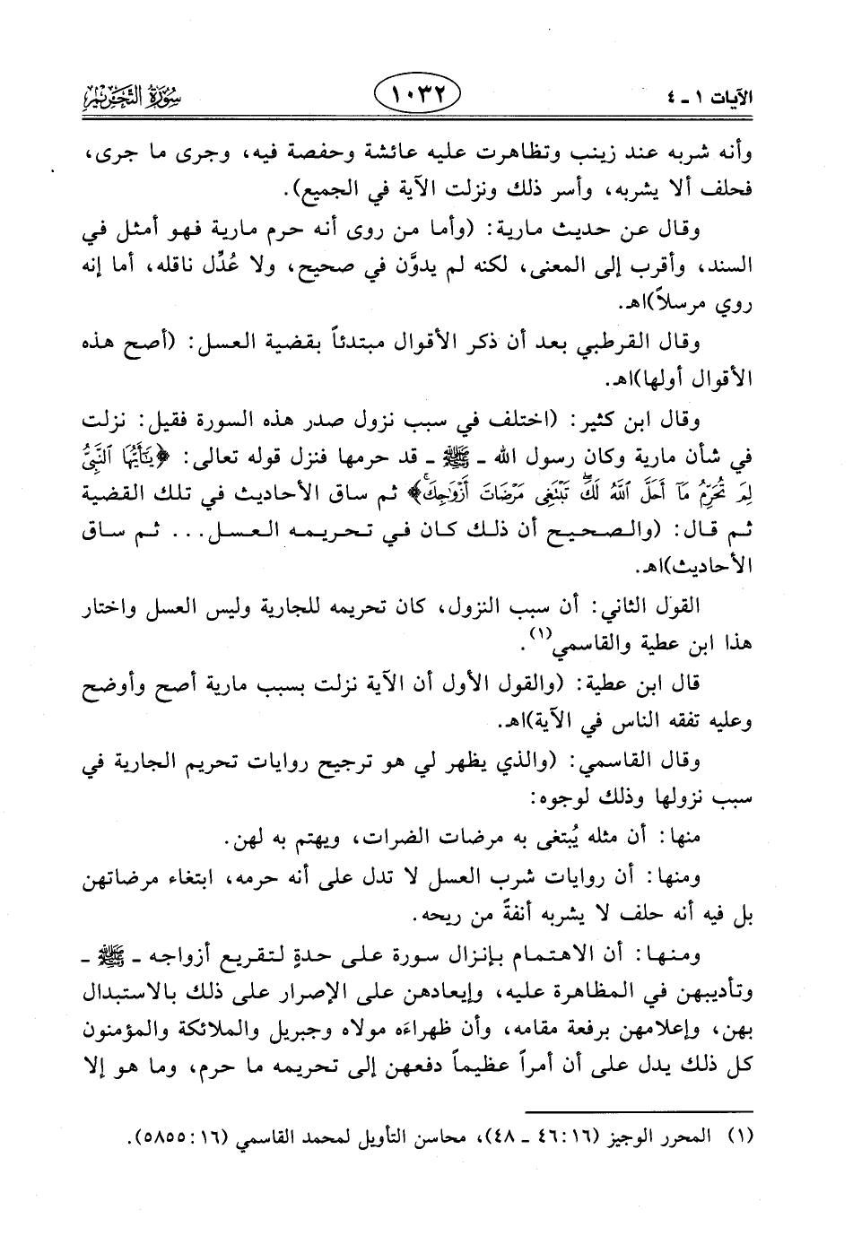 وقال ابن كثير: (اختلف في سبب نزول صدر هذه السورة فقيل: نزلت في شأن مارية وكان رسول اللَّه - صَلَّى اللَّهُ عَلَيْهِ وَسَلَّمَ - قد حرمها فنزل قوله تعالى: (يَا أَيُّهَا النَّبِيُّ لِمَ تُحَرِّمُ مَا أَحَلَّ اللَّهُ لَكَ تَبْتَغِي مَرْضَاتَ أَزْوَاجِكَ) ثم ساق الأحاديث في تلك القضية ثم قال: (والصحيح أن ذلك كان في تحريمه العسل ... ثم ساق الأحاديث) اهـ.