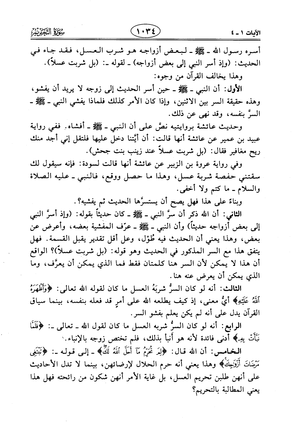 الثاني: أن الله ذكر أن سرَّ النبي - صَلَّى اللَّهُ عَلَيْهِ وَسَلَّمَ - كان حديثاً بقوله: (وَإِذْ أَسَرَّ النَّبِيُّ إِلَى بَعْضِ أَزْوَاجِهِ حَدِيثًا) وأن النبي - صَلَّى اللَّهُ عَلَيْهِ وَسَلَّمَ - عرّف المفشية بعضه، وأعرض عن بعض، وهذا يعني أن الحديث فيه طُوْل، وعلى أقل تقدير يقبل القسمة. فهل يتفق هذا مع السر المذكور في الحديث وهو قوله: (بل شربتِ عسلاً)؟ الواقع أن هذا لا يمكن لأن السر هنا كلمتان فقط فما الذي يمكن أن يعرَّف، وما الذي يمكن أن يعرض عنه هنا.
