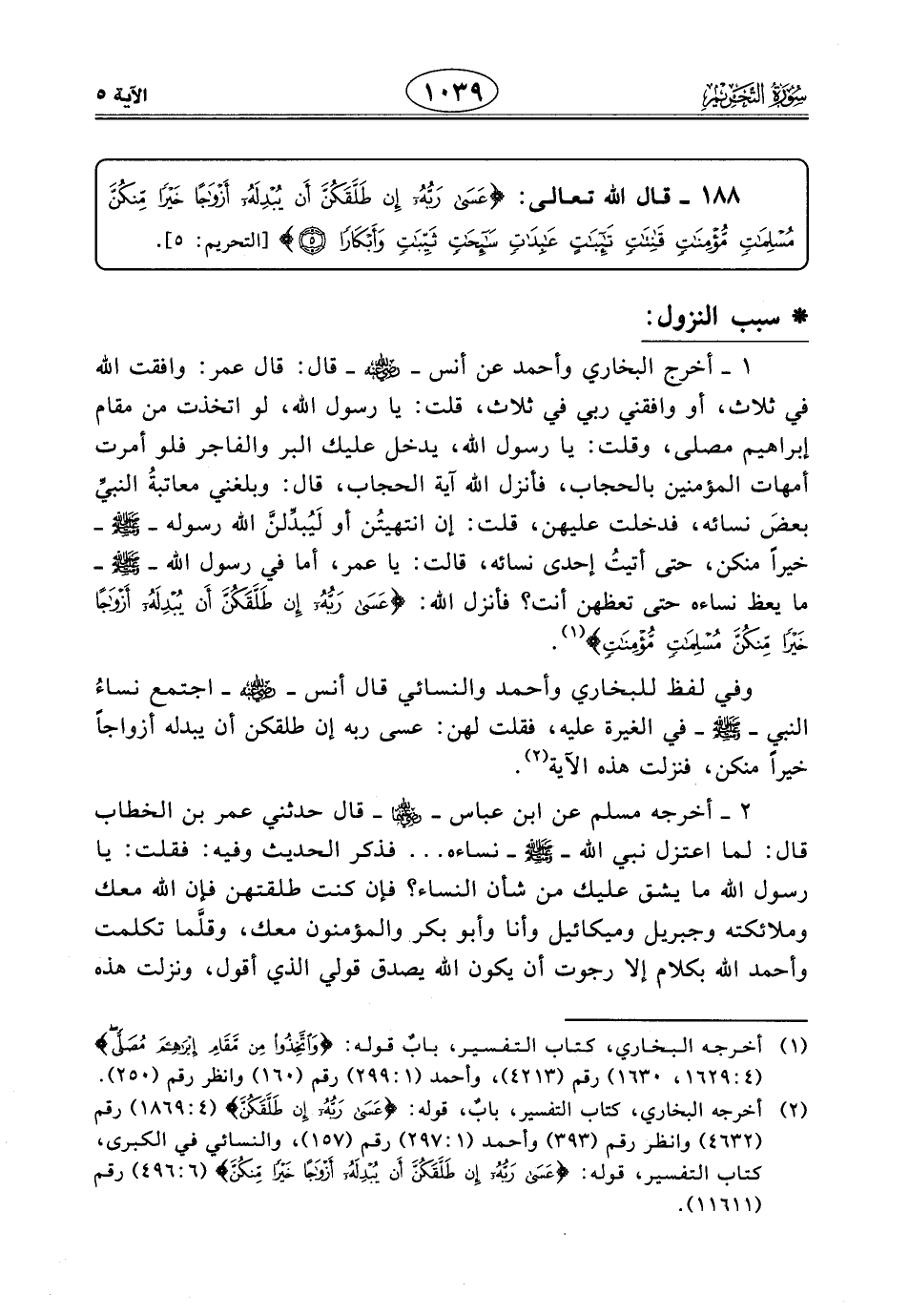 1 - أخرج البخاري وأحمد عن أنس - رَضِيَ اللَّهُ عَنْهُ - قال: قال عمر: وافقت الله في ثلاث، أو وافقني ربي في ثلاث، قلت: يا رسول الله، لو اتخذت من مقام إبراهيم مصلى، وقلت: يا رسول الله، يدخل عليك البر والفاجر فلو أمرت أمهات المؤمنين بالحجاب، فأنزل الله آية الحجاب، قال: وبلغني معاتبةُ النبيِّ بعضَ نسائه، فدخلت عليهن، قلت: إن انتهيتُن أو لَيُبدِّلنَّ اللَّه رسوله - صَلَّى اللَّهُ عَلَيْهِ وَسَلَّمَ - خيراً منكن، حتى أتيتُ إحدى نسائه، قالت: يا عمر، أما في رسول الله - صَلَّى اللَّهُ عَلَيْهِ وَسَلَّمَ - ما يعظ نساعه حتى تعظهن أنت؟ فأنزل الله: (عَسَى رَبُّهُ إِنْ طَلَّقَكُنَّ أَنْ يُبْدِلَهُ أَزْوَاجًا خَيْرًا مِنْكُنَّ مُسْلِمَاتٍ مُؤْمِنَاتٍ).