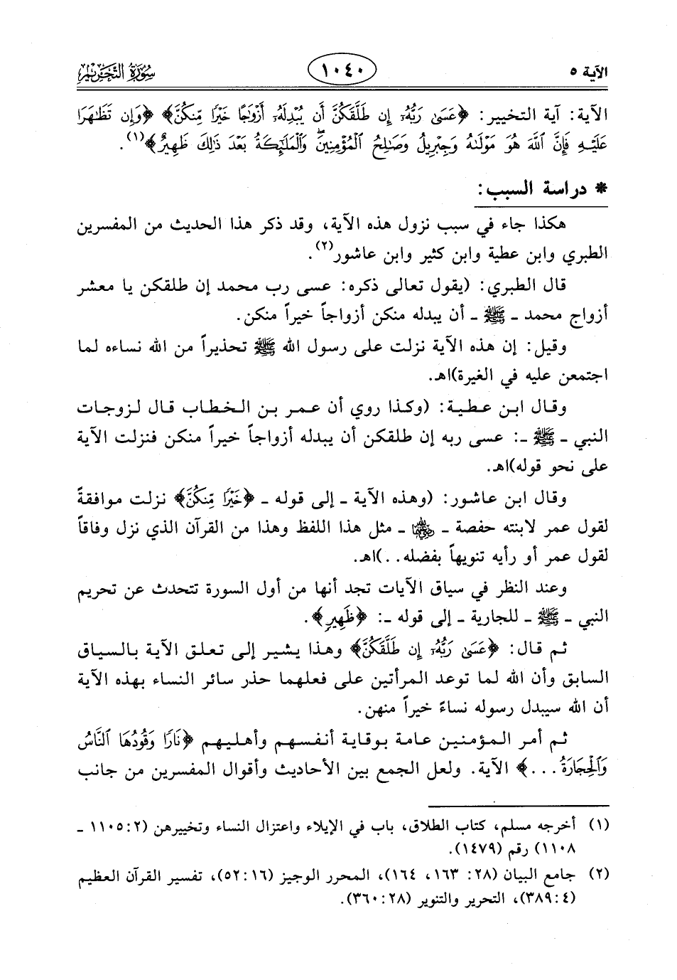 الآية: آية التخيير: (عَسَى رَبُّهُ إِنْ طَلَّقَكُنَّ أَنْ يُبْدِلَهُ أَزْوَاجًا خَيْرًا مِنْكُنَّ) (وَإِنْ تَظَاهَرَا عَلَيْهِ فَإِنَّ اللَّهَ هُوَ مَوْلَاهُ وَجِبْرِيلُ وَصَالِحُ الْمُؤْمِنِينَ وَالْمَلَائِكَةُ بَعْدَ ذَلِكَ ظَهِيرٌ).