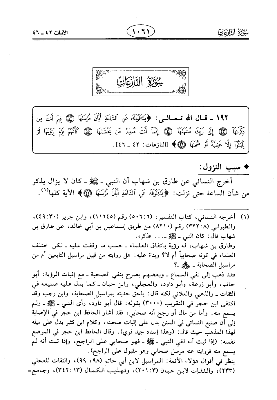 أخرج النَّسَائِي عن طارق بن شهاب أن النبي - صَلَّى اللَّهُ عَلَيْهِ وَسَلَّمَ - كان لا يزال يذكر من شأن الساعة حتى نزلت: (يَسْأَلُونَكَ عَنِ السَّاعَةِ أَيَّانَ مُرْسَاهَا) الآية كلها.
