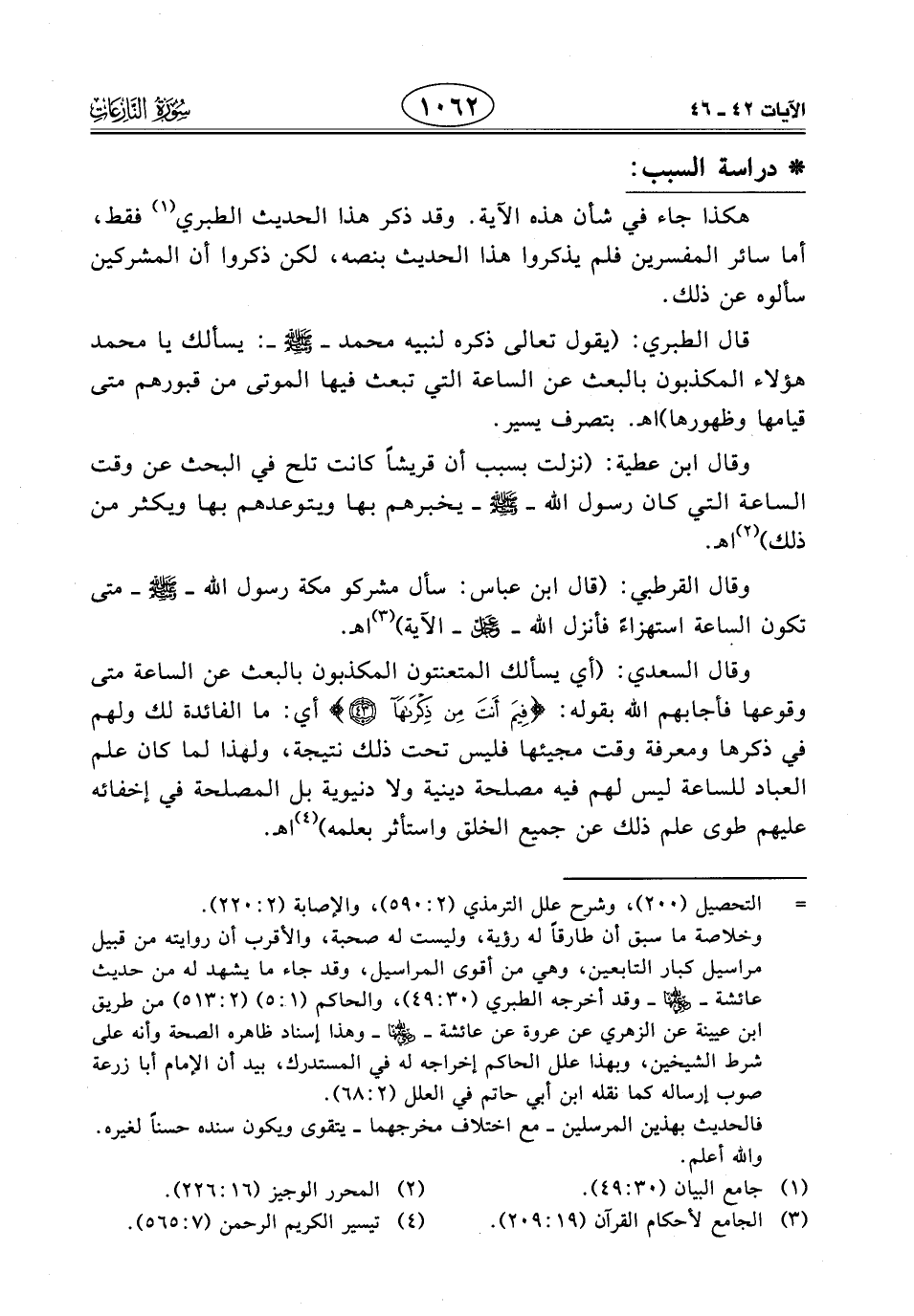 وقال القرطبي: (قال ابن عبَّاسٍ: سأل مشركو مكة رسول الله - صَلَّى اللَّهُ عَلَيْهِ وَسَلَّمَ - متى تكون الساعة استهزاء فأنزل اللَّه - عَزَّ وَجَلَّ - الآية) اهـ.