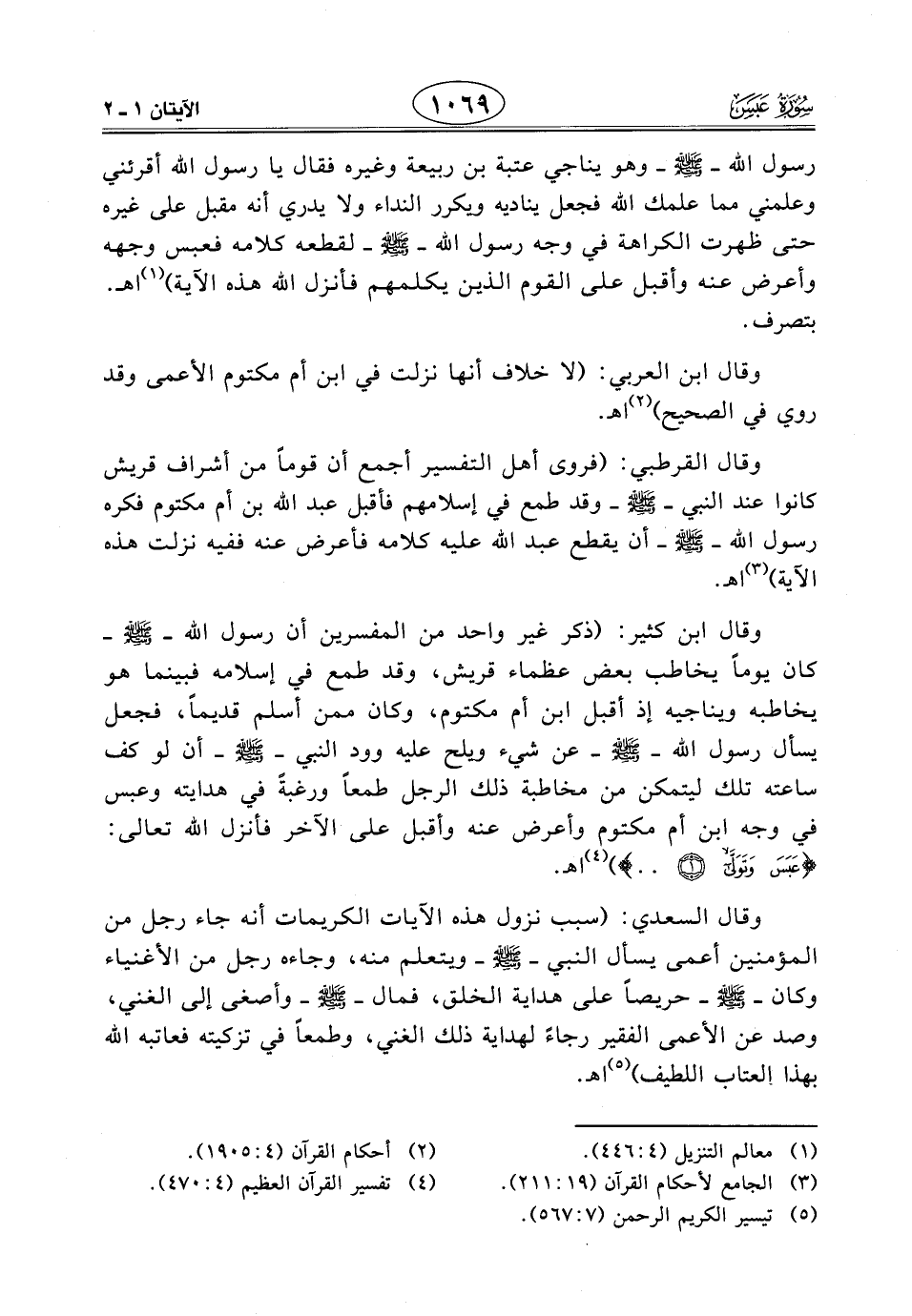 وقال القرطبي: (فروى أهل التفسير أجمع أن قومًا من أشراف قريش كانوا عند النبي - صَلَّى اللَّهُ عَلَيْهِ وَسَلَّمَ - وقد طمع في إسلامهم فأقبل عبد الله بن أم مكتوم فكره رسول اللَّه - صَلَّى اللَّهُ عَلَيْهِ وَسَلَّمَ - أن يقطع عبد اللَّه عليه كلامه فأعرض عنه ففيه نزلت هذه الآية) اهـ.