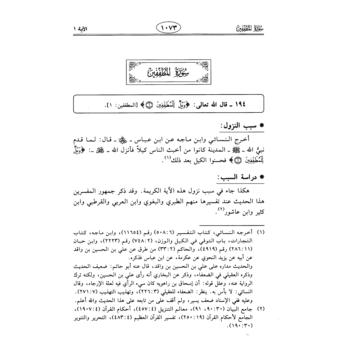 أخرج النَّسَائِي وابن ماجه عن ابن عبَّاسٍ - رَضِيَ اللَّهُ عَنْهُمَا - قال: لما قدم نبي الله - صَلَّى اللَّهُ عَلَيْهِ وَسَلَّمَ - المدينة كانوا من أخبث الناس كيلاً فأنزل اللَّه - عَزَّ وَجَلَّ -: (وَيْلٌ لِلْمُطَفِّفِينَ) فحسنوا الكيل بعد ذلك.