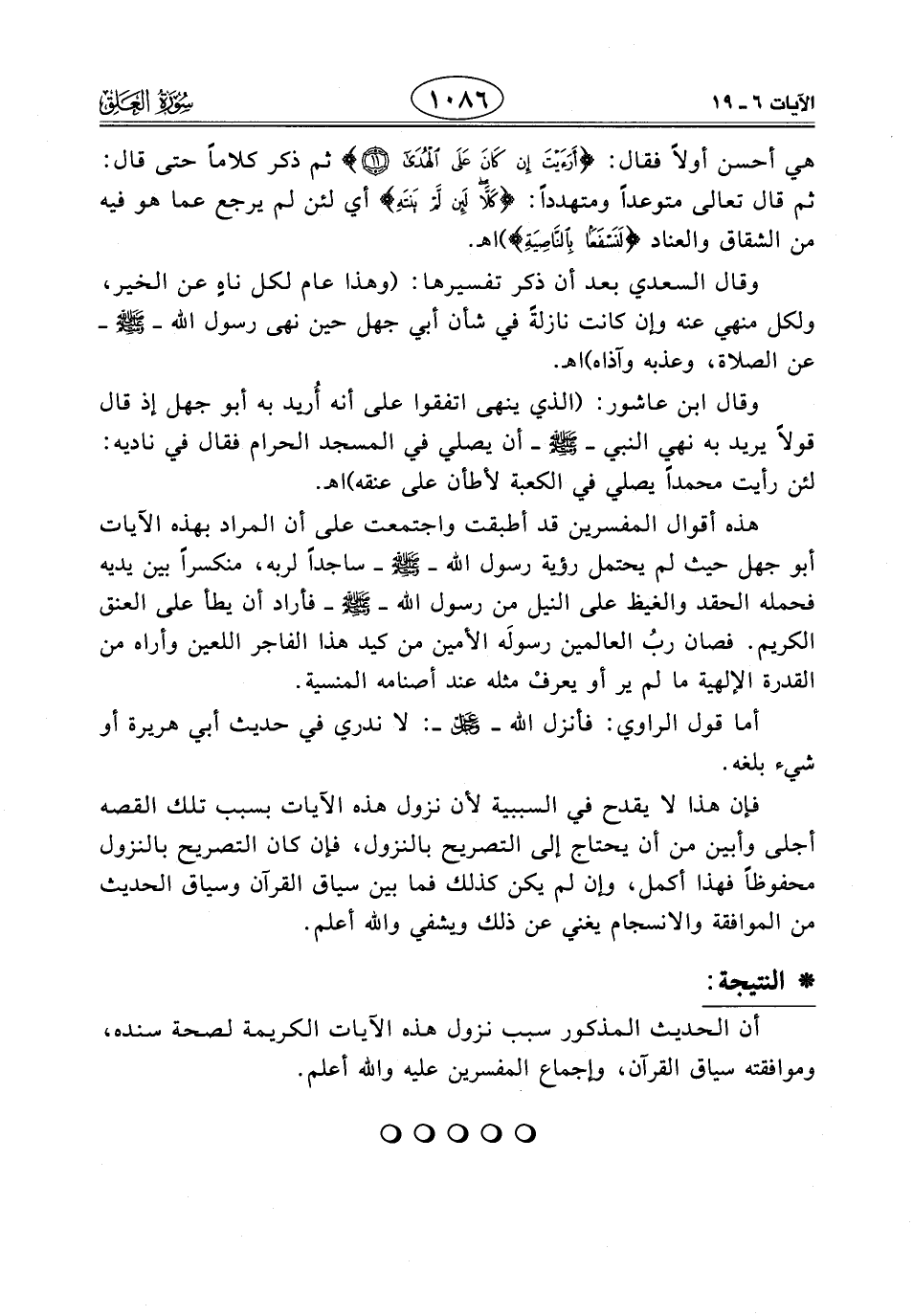 هذه أقوال المفسرين قد أطبقت واجتمعت على أن المراد بهذه الآيات أبو جهل حيث لم يحتمل رؤية رسول اللَّه - صَلَّى اللَّهُ عَلَيْهِ وَسَلَّمَ - ساجدا لربه، منكسراً بين يديه فحمله الحقد والغيظ على النيل من رسول اللَّه - صَلَّى اللَّهُ عَلَيْهِ وَسَلَّمَ - فأراد أن يطأ على العنق الكريم. فصان ربُّ العالمين رسولَه الأمين من كيد هذا الفاجر اللعين وأراه من القدرة الإلهية ما لم ير أو يعرفْ مثله عند أصنامه المنسية.