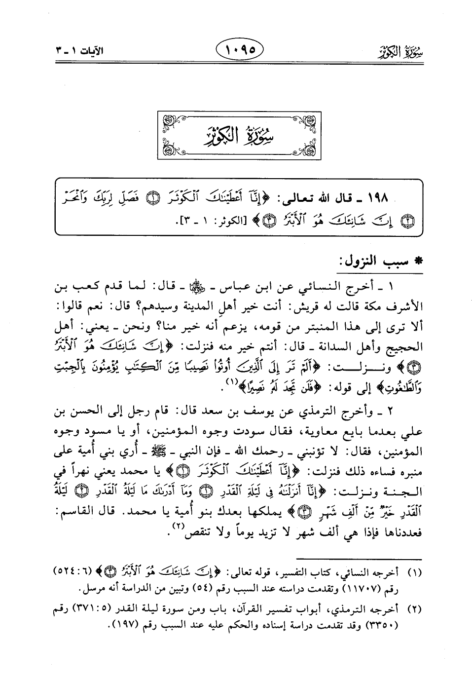 1 - أخرج النَّسَائِي عن ابن عبَّاسٍ - رَضِيَ اللَّهُ عَنْهُمَا - قال: لما قدم كعب بن الأشرف مكة قالت له قريش: أنت خير أهلِ المدينة وسيدهم؟ قال: نعم قالوا: ألا ترى إلى هذا المنبتر من قومه، يزعم أنه خير منا؟ ونحن - يعني: أهل الحجيج وأهل السدانة - قال: أنتم خير منه فنزلت: (إِنَّ شَانِئَكَ هُوَ الْأَبْتَرُ) ونزلت: (أَلَمْ تَرَ إِلَى الَّذِينَ أُوتُوا نَصِيبًا مِنَ الْكِتَابِ يُؤْمِنُونَ بِالْجِبْتِ وَالطَّاغُوتِ) إلى قوله: (فَلَنْ تَجِدَ لَهُ نَصِيرًا).
