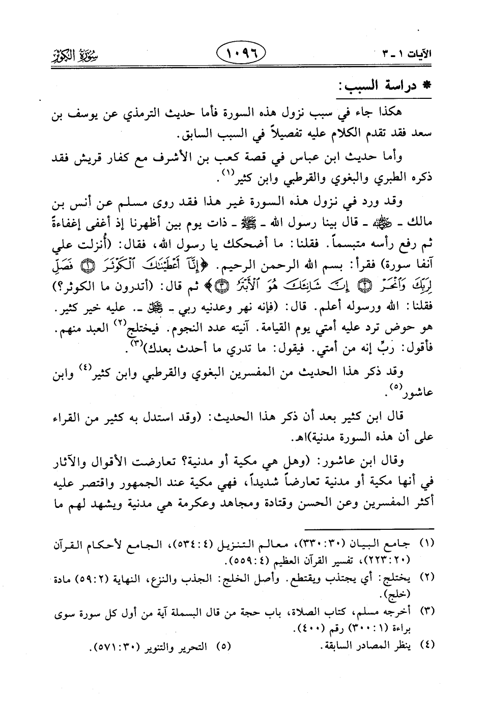 وقد ورد في نزول هذه السورة غير هذا فقد روى مسلم عن أنس بن مالك - رَضِيَ اللَّهُ عَنْهُ - قال بينا رسول الله - صَلَّى اللَّهُ عَلَيْهِ وَسَلَّمَ - ذات يوم بين أظهرنا إذ أغفى إغفاءةً ثم رفع رأسه متبسماً. فقلنا: ما أضحكك يا رسول الله، فقال: (أُنزلت علي آنفا سورة) فقرأ: بِسْمِ اللَّهِ الرَّحْمَنِ الرَّحِيمِ. (إِنَّا أَعْطَيْنَاكَ الْكَوْثَرَ (1) فَصَلِّ لِرَبِّكَ وَانْحَرْ (2) إِنَّ شَانِئَكَ هُوَ الْأَبْتَرُ (3)، ثم قال: (أتدرون ما الكوثر؟) فقلنا: الله ورسوله أعلم. قال: (فإنه نهر وعدنيه ربي - عَزَّ وَجَلَّ - عليه خير كثير. هو حوض ترد عليه أمتي يوم القيامة. آنيته عدد النجوم. فيختلج العبد منهم. فأقول: ربِّ إنه من أمتي. فيقول: ما تدري ما أحدث بعدك).