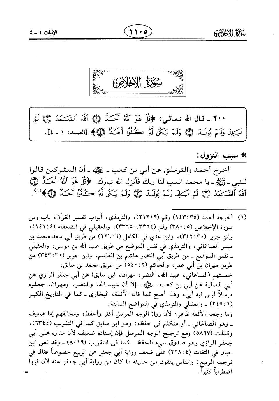 200 - قال الله تعالى: (قُلْ هُوَ اللَّهُ أَحَدٌ (1) اللَّهُ الصَّمَدُ (2) لَمْ يَلِدْ وَلَمْ يُولَدْ (3) وَلَمْ يَكُنْ لَهُ كُفُوًا أَحَدٌ (4)
