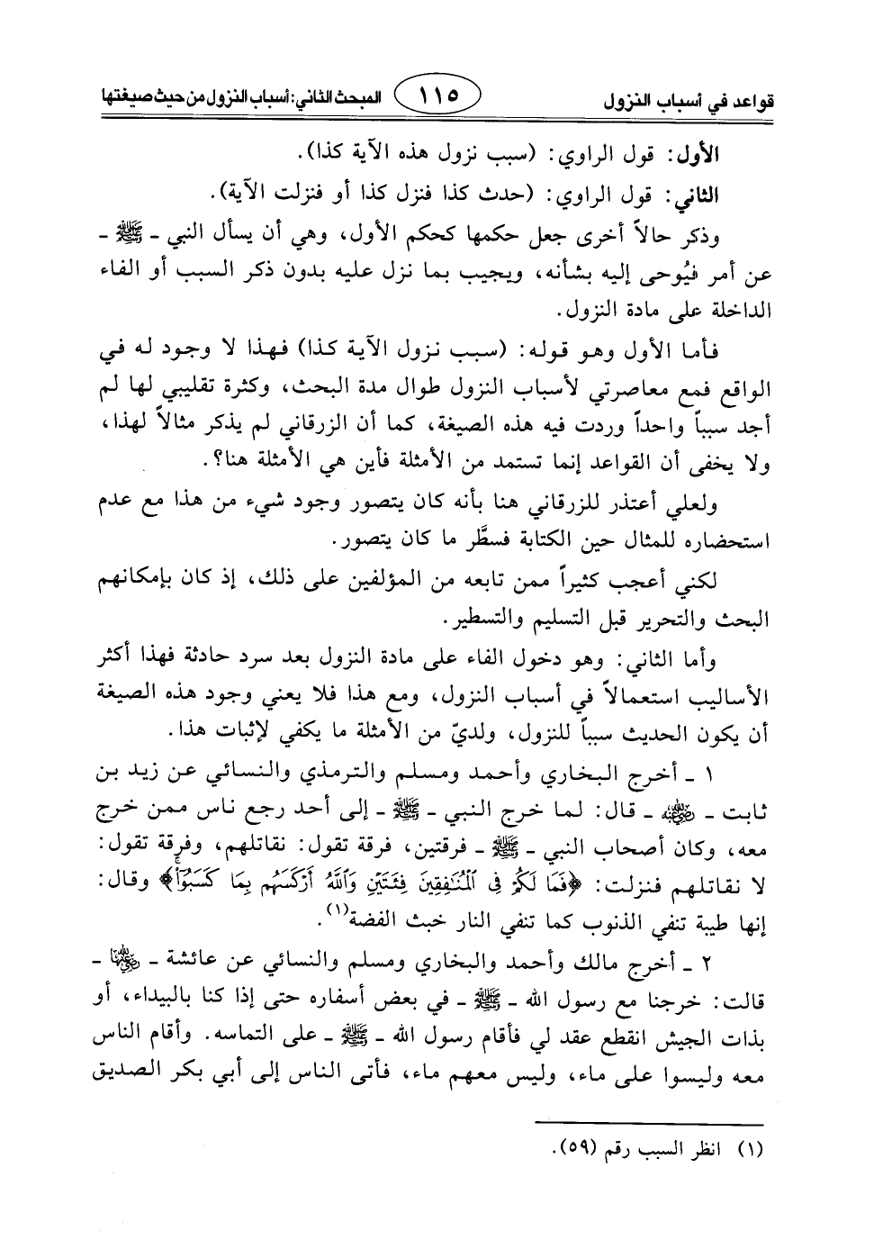فأما الأول وهو قوله: (سبب نزول الآية كذا) فهذا لا وجود له في الواقع فمع معاصرتي لأسباب النزول طوال مدة البحث، وكثرة تقليبي لها لم أجد سببًا واحدًا وردت فيه هذه الصيغة، كما أن الزرقاني لم يذكر مثالاً لهذا، ولا يخفى أن القواعد إنما تستمد من الأمثلة فأين هي الأمثلة هنا؟.