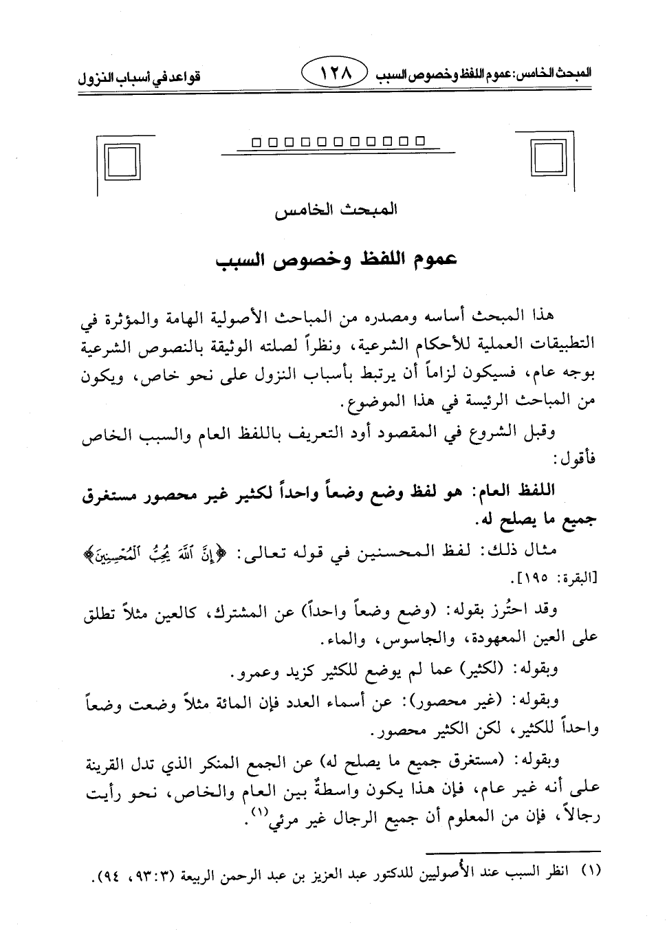 هذا المبحث أساسه ومصدره من المباحث الأصولية الهامة والمؤثرة في التطبيقات العملية للأحكام الشرعية، ونظراً لصلته الوثيقة بالنصوص الشرعية بوجه عام، فسيكون لزاماً أن يرتبط بأسباب النزول على نحو خاص، ويكون من المباحث الرئيسة في هذا الموضوع.