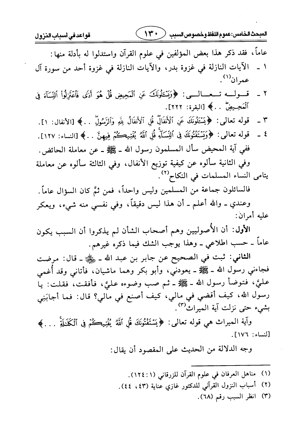 الأول: أن الأُصوليين وهم أصحاب الشأن لم يذكروا أن السبب يكون عاماً - حسب اطلاعي - وهذا يوجب الشك فيما ذكره غيرهم.