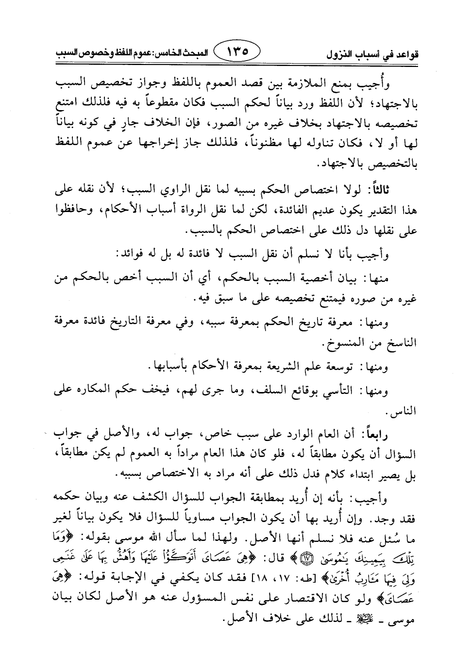 رابعاً: أن العام الوارد على سبب خاص، جواب له، والأصل في جواب السؤال أن يكون مطابقاً له، فلو كان هذا العام مراداً به العموم لم يكن مطابقًا، بل يصير ابتداء كلام فدل ذلك على أنه مراد به الاختصاص بسببه.