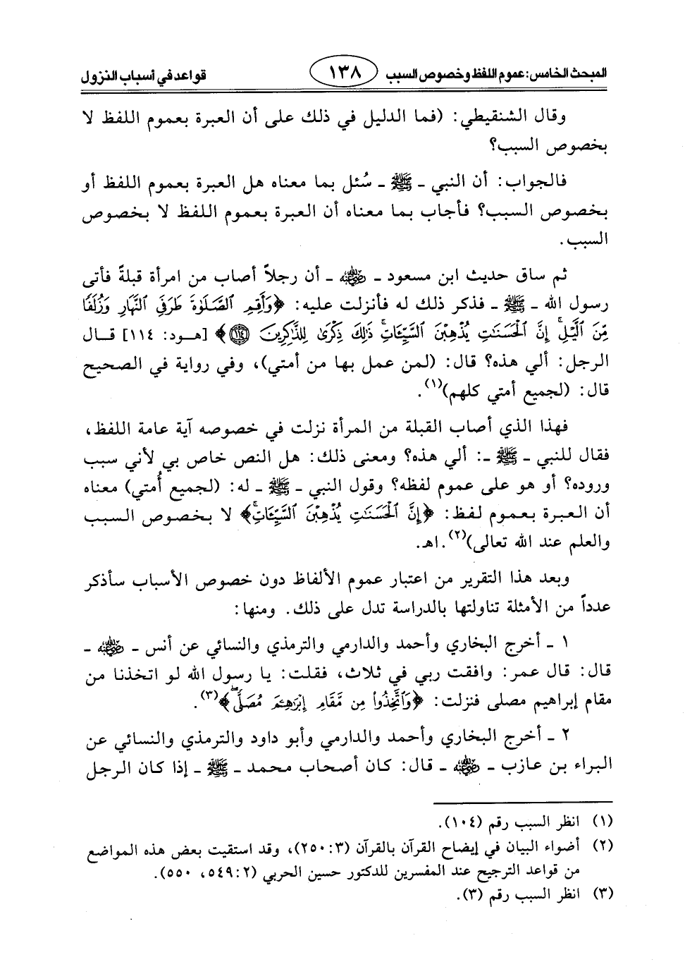 فهذا الذي أصاب القبلة من المرأة نزلت فى خصوصه آية عامة اللفظ، فقال للنبي - صَلَّى اللَّهُ عَلَيْهِ وَسَلَّمَ -: ألي هذه؟ ومعنى ذلك: هل النص خاص بي لأني سبب وروده؟ أو هو على عموم لفظه؟ وقول النبي - صَلَّى اللَّهُ عَلَيْهِ وَسَلَّمَ - له: (لجميع أُمتي) معناه أن العبرة بعموم لفظ: (إِنَّ الْحَسَنَاتِ يُذْهِبْنَ السَّيِّئَاتِ) لا بخصوص السبب والعلم عند اللَّه تعالى). اهـ.
